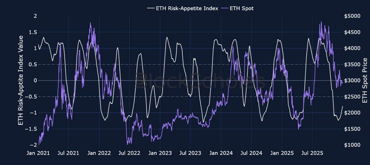 Figure 2. Block Scholes ETH Risk-Appetite Index (white, left-hand axis) and ETH spot price (purple, right-hand axis)