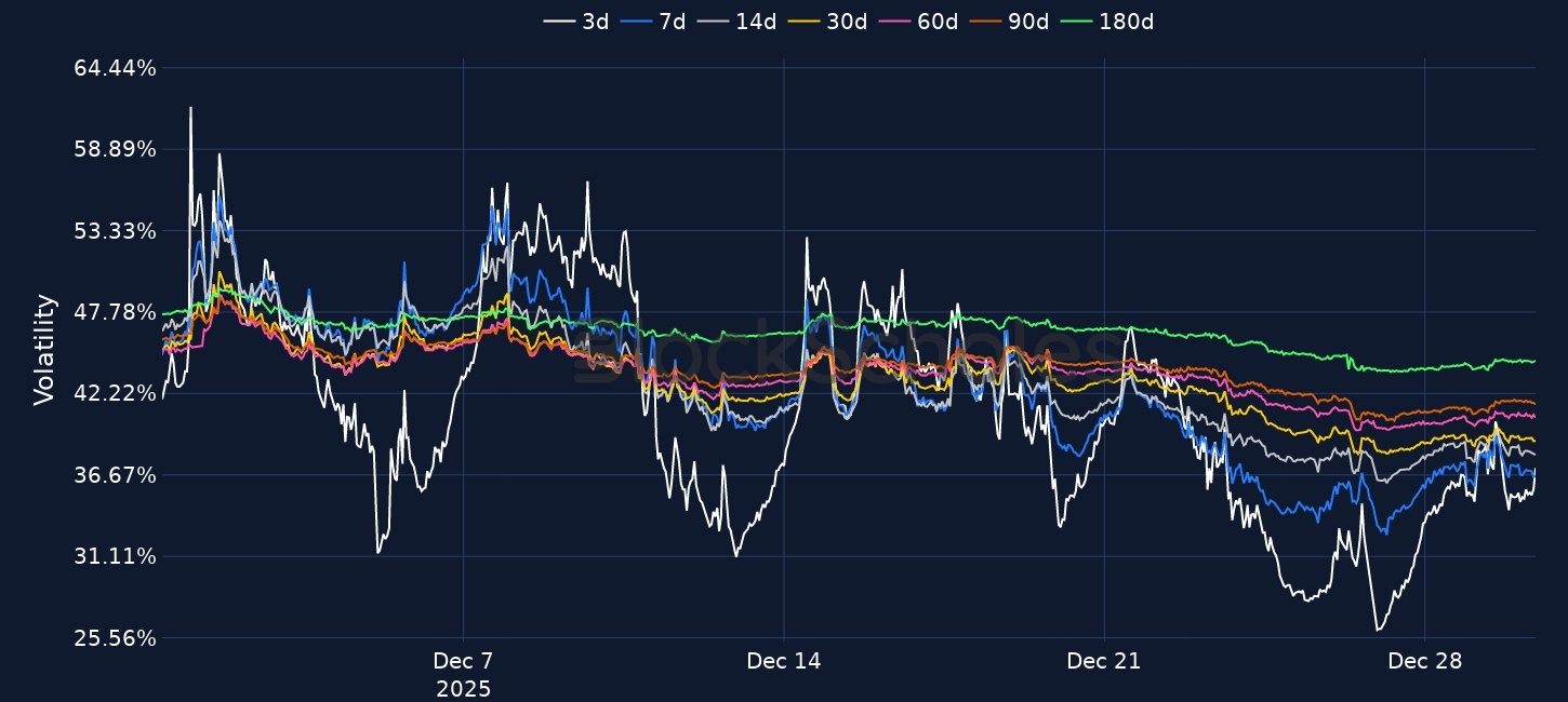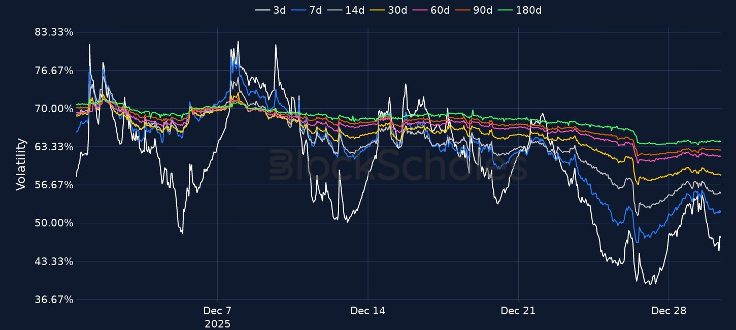 Figure 3. BTC at-the-money implied volatility across selected tenors. Source: Deribit, Block Scholes