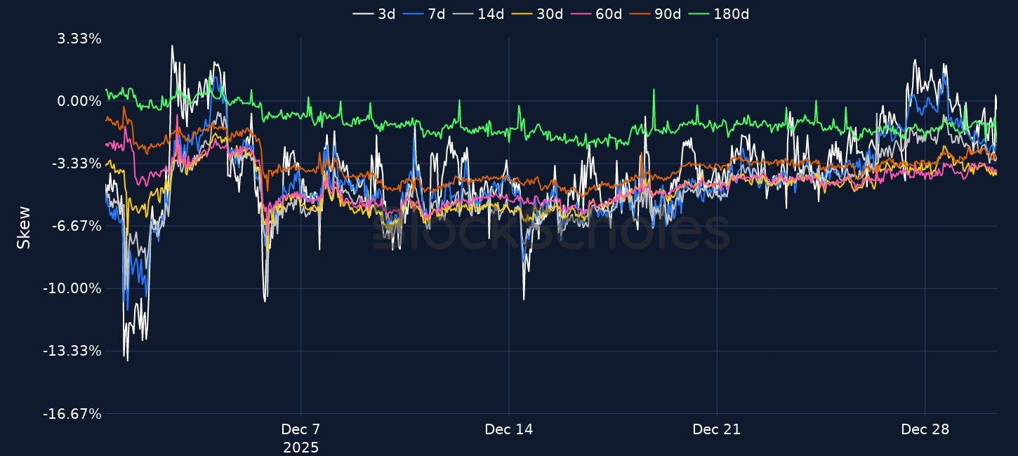 Figure 5. BTC 25-delta put-call skew ratio across selected tenors. Source: Deribit, Block Scholes