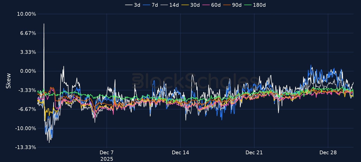Figure 6. ETH 25-delta put-call skew ratio across selected tenors. Source: Deribit, Block Scholes