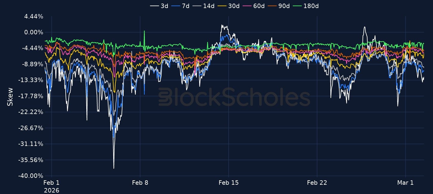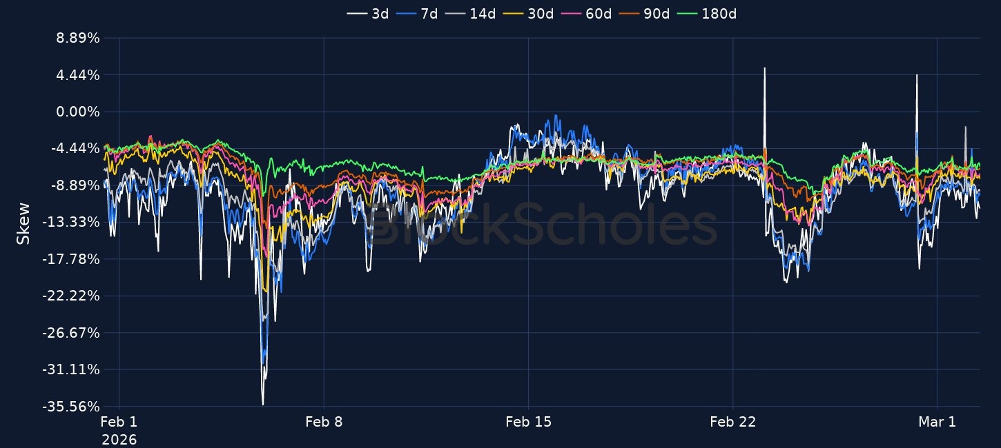 Escalating US–Iran tensions triggered a brief risk-off move in crypto, with BTC dipping from about $65K to about $63K and ETH down to around $1.8K before both recovered into Monday. Options markets show only mild front-end inversion and puts remain bid, signalling ongoing demand for downside protection despite the bounce. TradFi is now repricing the shock, with global equities down roughly 1%, Brent up more than 10% above $80 on Strait of Hormuz risk, and precious metals higher, while Treasuries sold off and the 10-year yield rose about 3bps to roughly 3.97%. Morgan Stanley’s trust bank charter filing adds to the institutional build-out narrative, alongside scrutiny of prediction markets, Vitalik’s proposed execution-layer upgrades, and Paradigm’s planned $1.5B frontier tech fund.