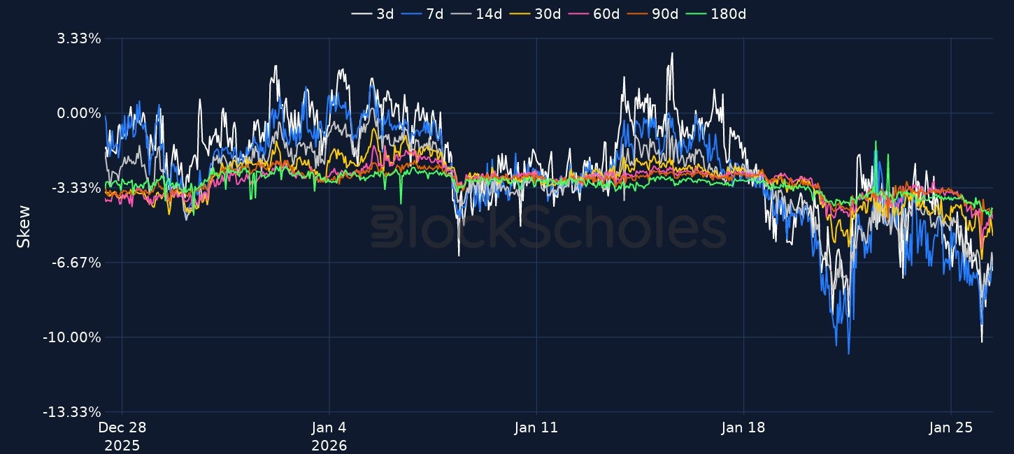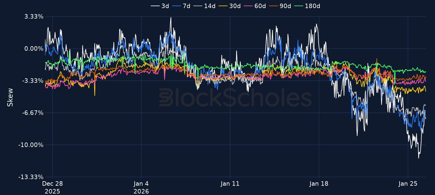- Signs of defensive positioning are also appearing in derivatives markets. The 25-delta put-call skew ratio for 7-day BTC options currently trades close to -7%, after reaching -9% earlier in the day. Skew for ETH is also tilted towards downside protection — having fallen to -8% during early Asian trading hours.