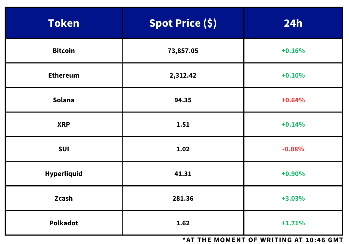 BTC briefly moved above $76K before falling back to around $74K, ending an eight-day winning streak, though continued spot ETF inflows are still providing support. Broader risk sentiment remained steady with US equities grinding higher, but the conflict in the Middle East continues to keep pressure on oil and macro nerves elevated. In crypto policy, the SEC and CFTC released fresh guidance that sharpens the distinction between securities and non-security crypto assets, while Moody’s and Ripple both pointed to deeper institutional adoption through new onchain credit infrastructure and an expanded digital asset push in Brazil.