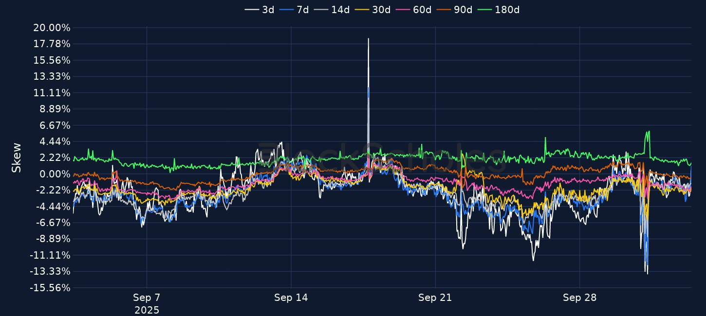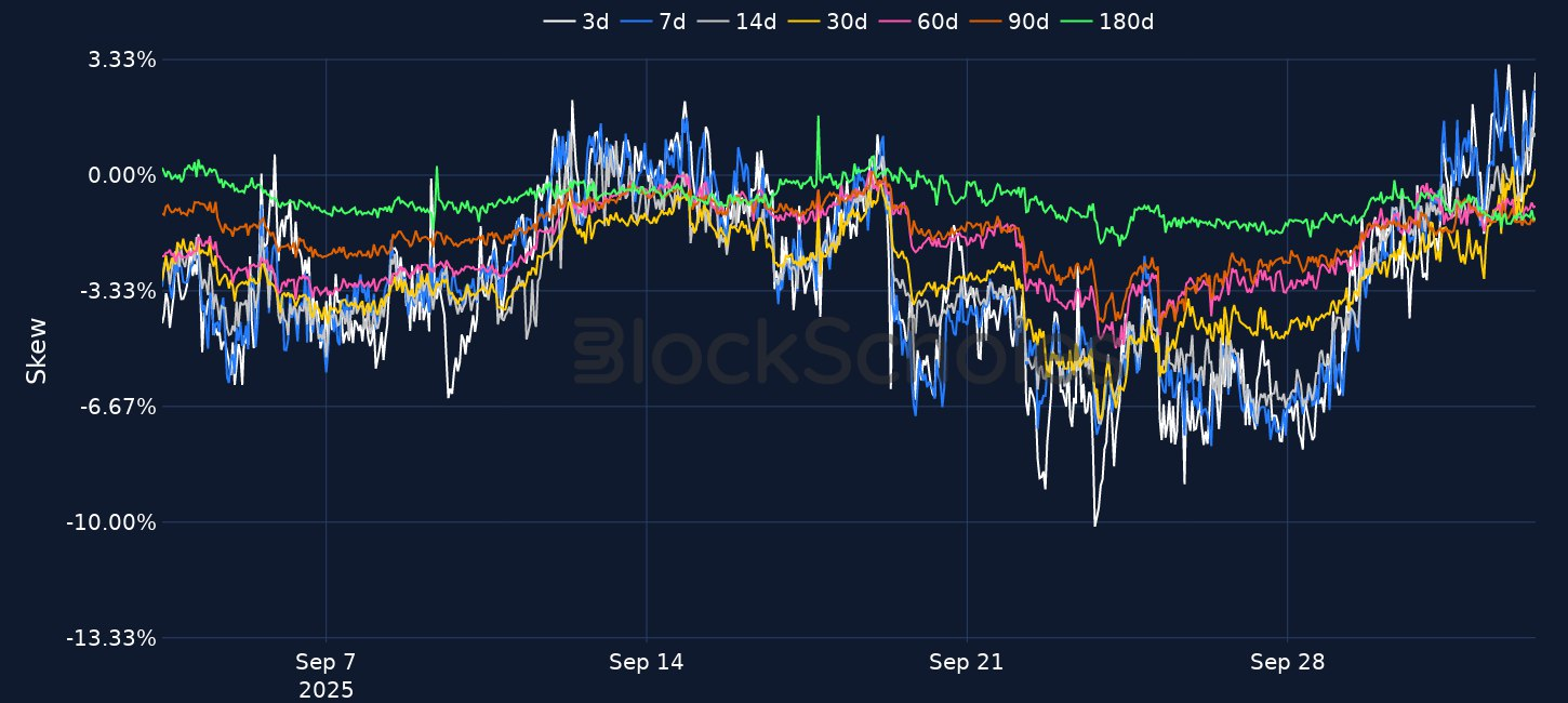 Following a breakout past $120K, short-tenor BTC options which had shown a persistent skew towards put options in September now express a higher relative demand for calls over puts. That bullish positioning has yet to extend out to longer-dated options however, suggesting the newfound optimism isn’t spreading out to all of Q4 just yet. ETH options markets on the other hand continue to lean bearish, despite a bigger move in spot price and a week of strong Spot ETF inflows. Wall St financial markets operated in the dark amidst a data blackout given the US federal government shutdown, while President Trump's administration is weighing up a major slash to federal jobs. CME Group has announced an upcoming roll out of crypto futures and options “available to trade 24 hours a day, seven days a week” in early 2026, subject to regulatory approval.