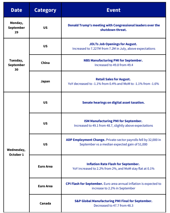 - While the crypto market marches forward, momentum has slowed down in US equity markets as we enter the third day of the US federal government shutdown. The S&P 500 eked out a very small gain of 0.062% yesterday, though the Nasdaq 100 climbed slightly higher at 0.37%.