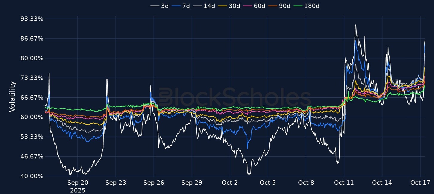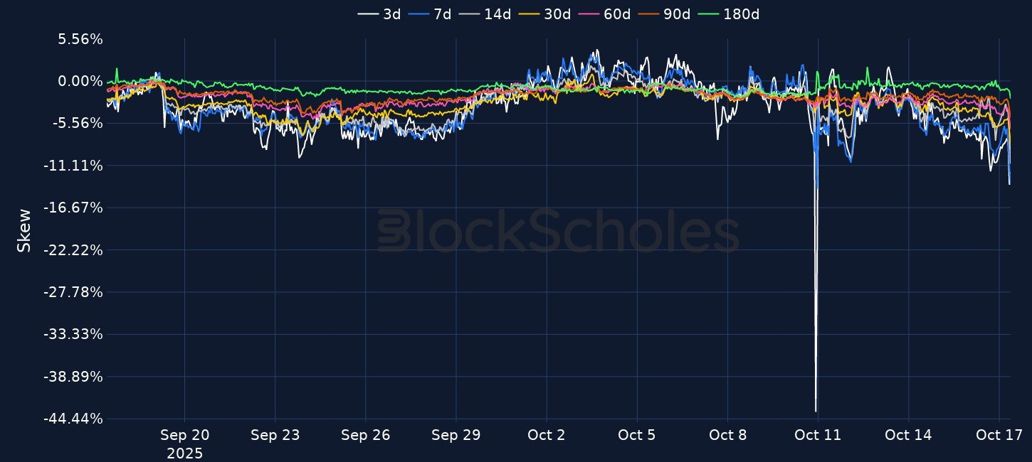 A jump in the VIX index to its highest level since April 2025 has seen crypto assets continue to extend their losses, while US equities equally sold off in yesterday's trading session. China-US tensions remain and the share price of two regional US banks plunged yesterday. Shorter-dated BTC and ETH tenors in options markets have blown out, resulting in a firm inversion in ETH’s term structure of volatility and a milder inversion for BTC. 7-day ETH skew is currently trading at -13.1%, even lower than the levels reached last Friday, as its spot price trades down 7% over the past 24 hours.
