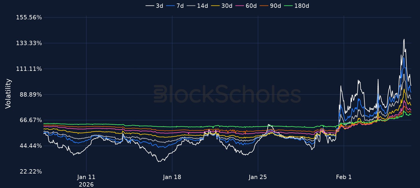 - Just since the start of the month, short-dated BTC implied volatility has more than doubled.