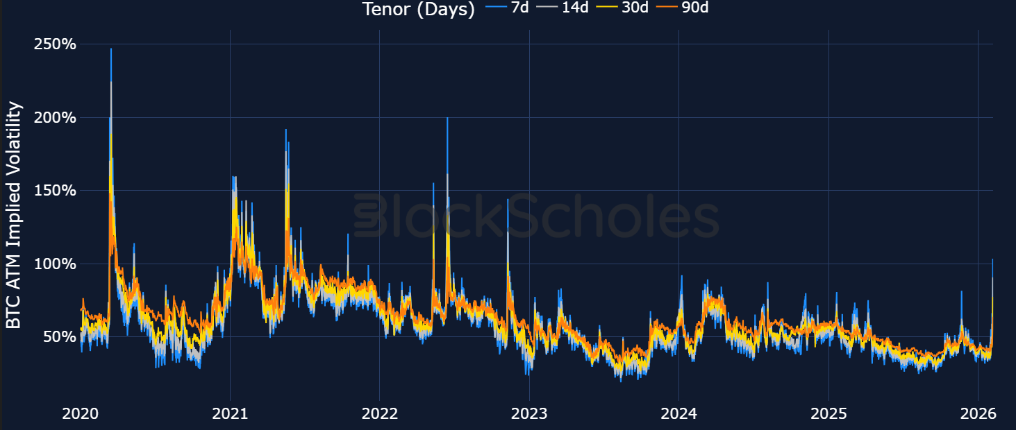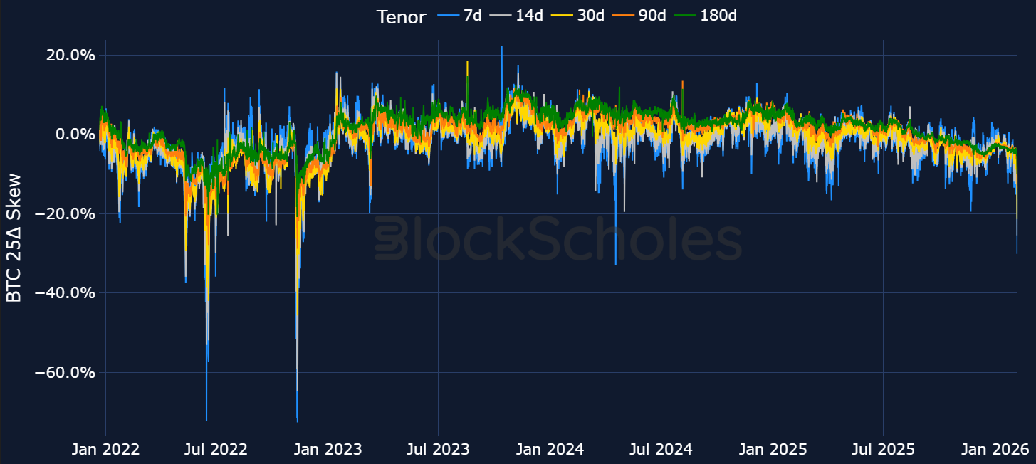 The largest single-day drop since the collapse of FTX in November 2022 pushed BTC below $60K, with clear signs of panic in derivatives markets. Funding rates fell to their lowest since December 2024, while more than $2.6B in positions have been liquidated in the past 24 hours alone. ATM implied volatility for BTC and ETH has surged to levels last seen in November 2022, with 7-day skew briefly trading at -30%. In response to the near 50% drawdown from ATH, Strategy's CEO Phong Le responded that $8,000 per BTC is "the point at which our bitcoin reserve equals our net debt". US equities also traded lower following weaker-than-expected labour market data.