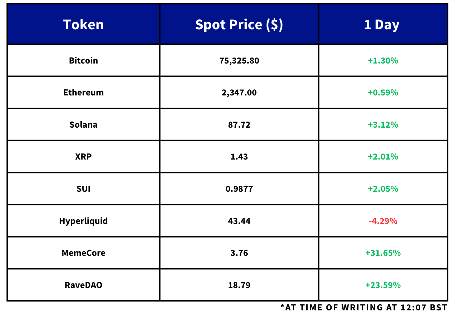 • The risk appetite has continued to prevail across financial markets as US equities recorded yet another all-time high yesterday, while BTC continues to consolidate around $75K — supported by three days of Spot ETF inflows.