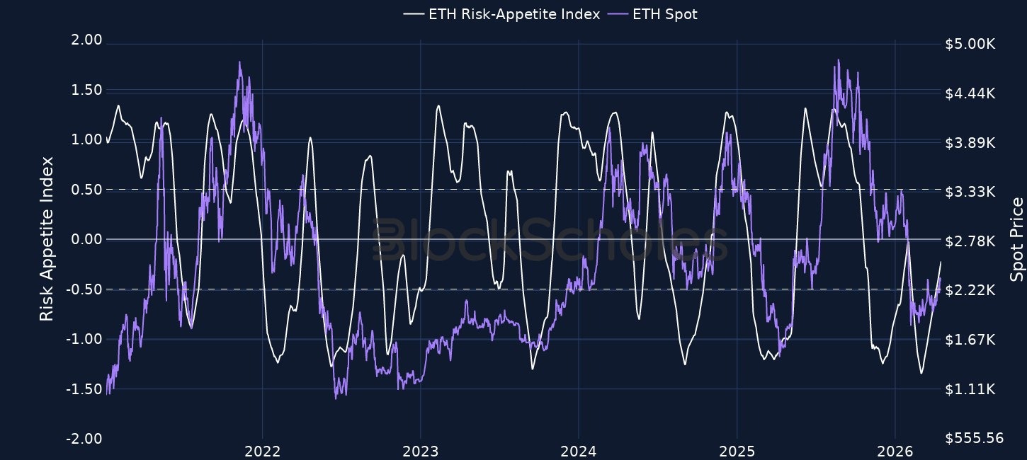 Figure 2. Block Scholes ETH Risk-Appetite Index (white, left-hand axis) and ETH spot price (purple, right-hand axis)