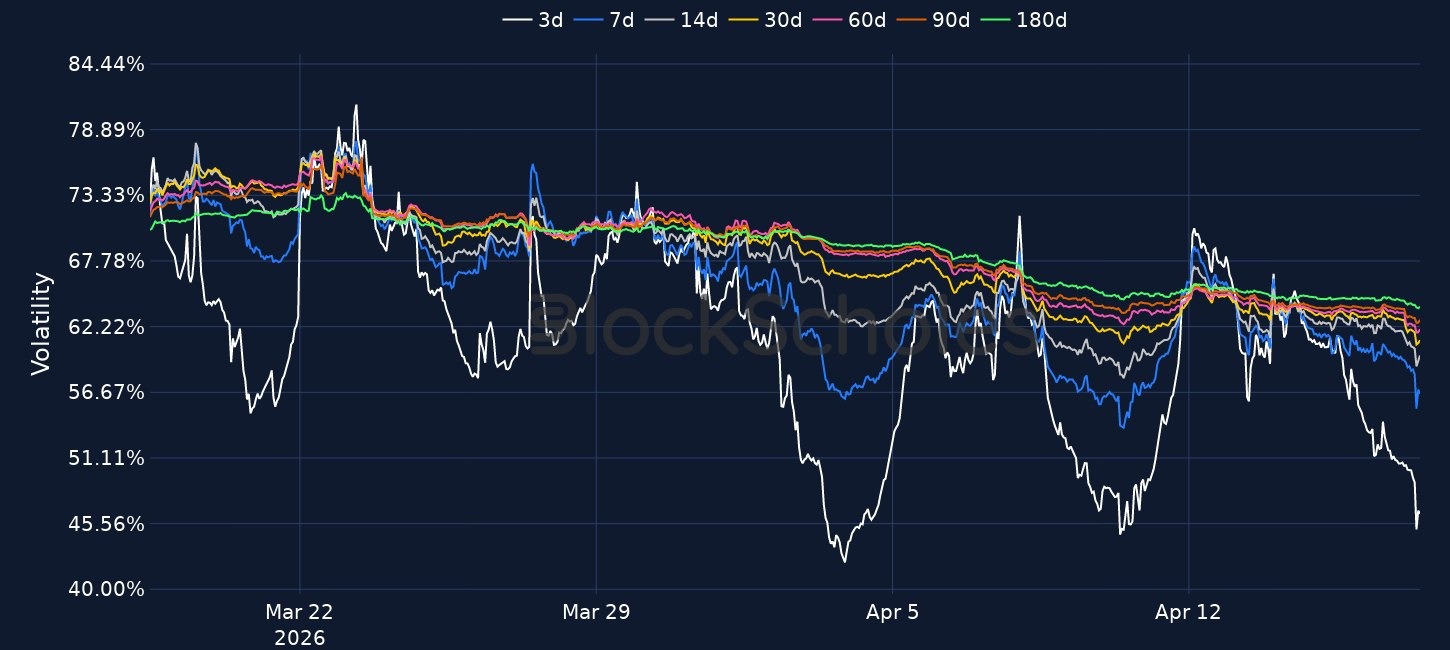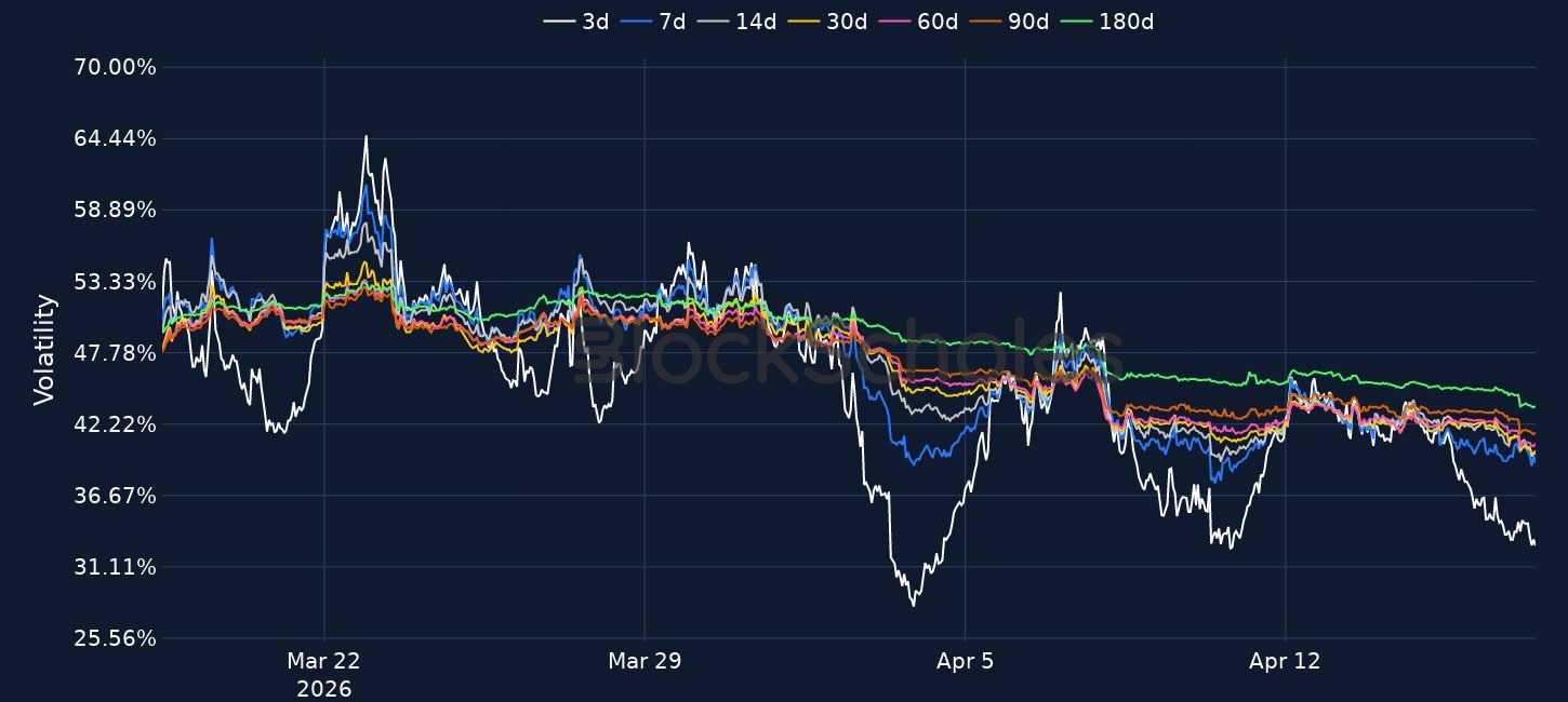 Figure 3. BTC at-the-money implied volatility across selected tenors. Source: Deribit, Block Scholes