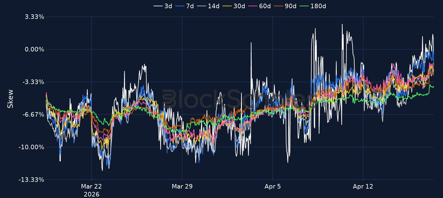 US equities hit fresh record highs, with the S&P 500 up 0.8% and the Nasdaq-100 rising 1.4%, while BTC traded near $75K as oil prices steadied on signs of an extended US-Iran ceasefire. In options, ETH’s 7-day skew briefly flipped towards calls before returning to a modest put premium, while BTC positioning remained more cautious.