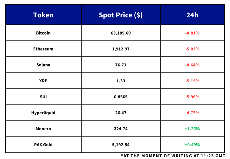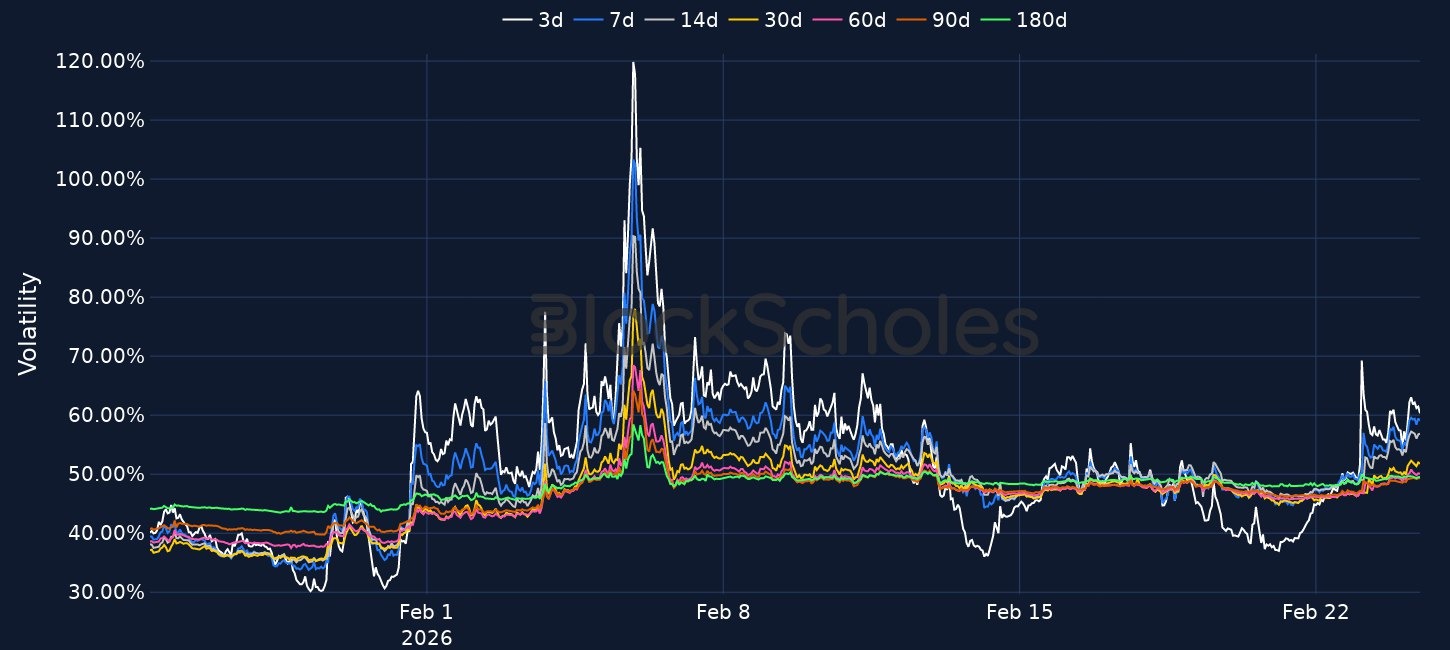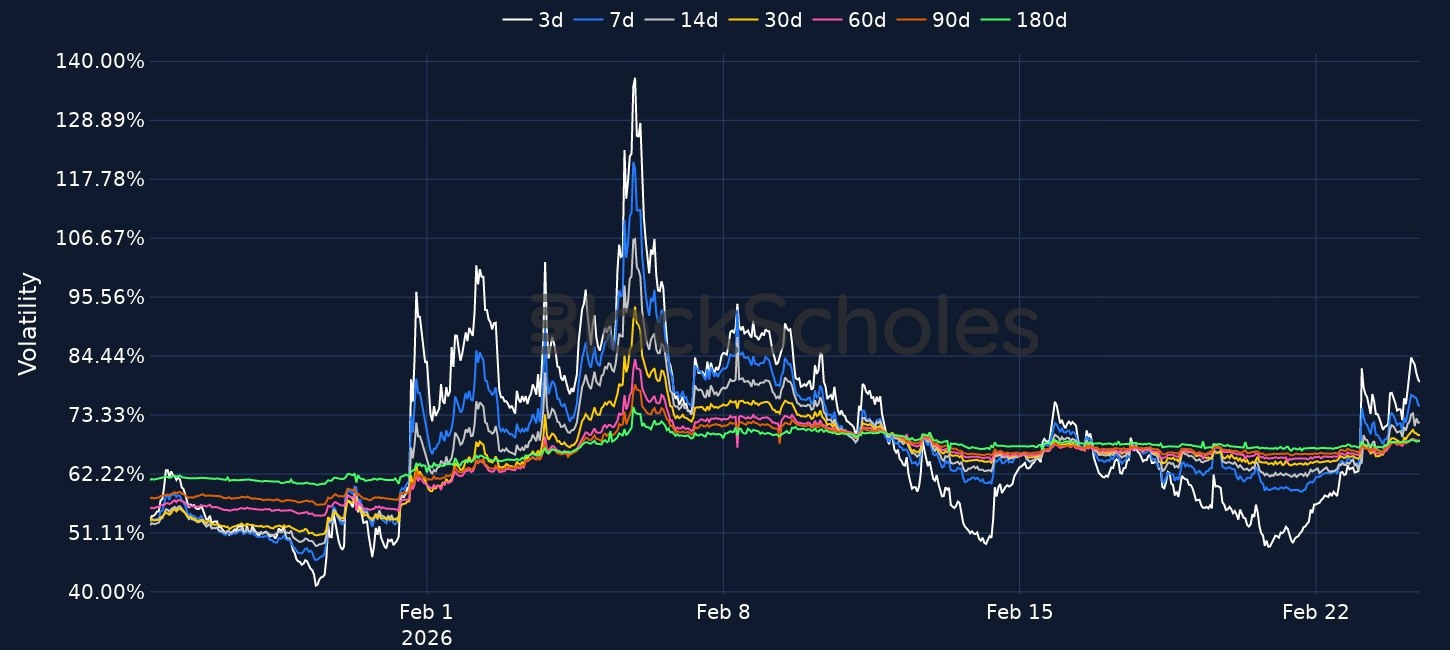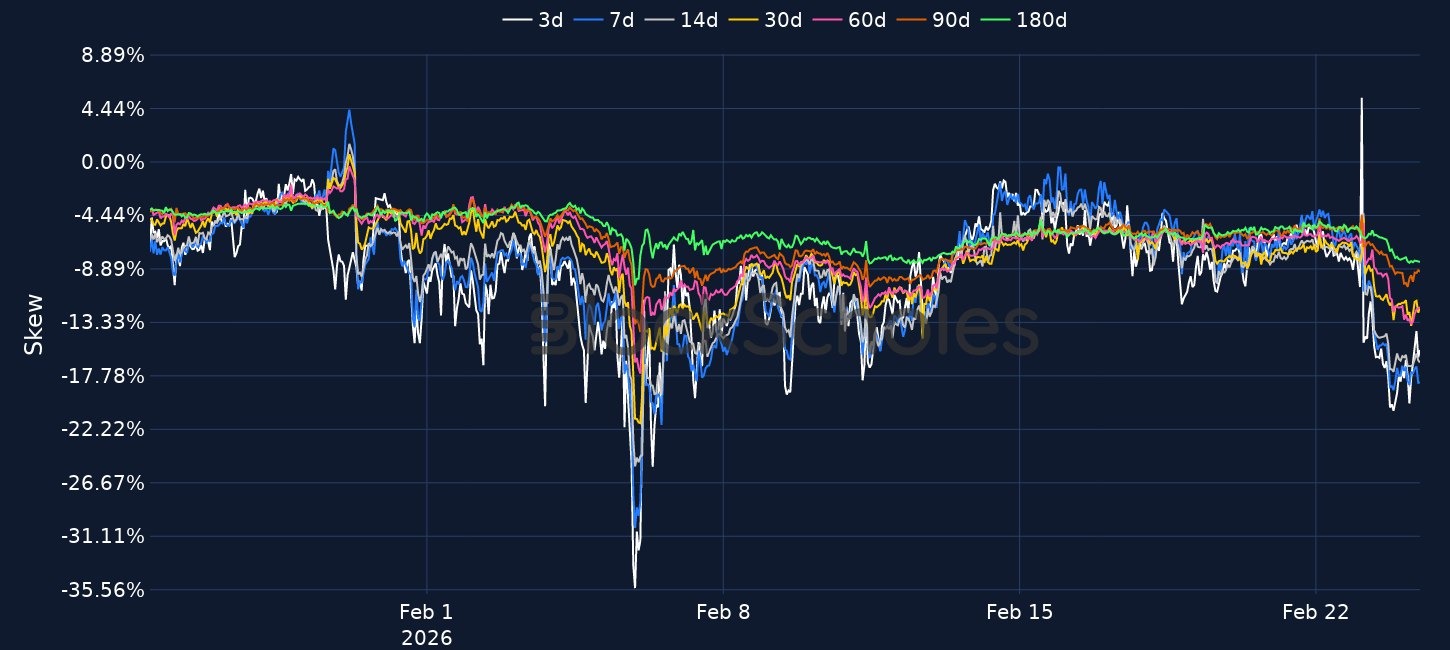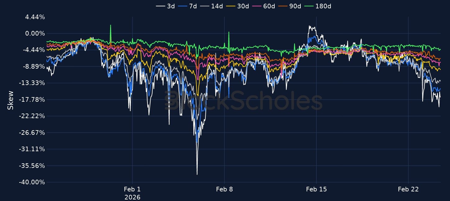 Risk appetite keeps weakening as BTC briefly fell to $62K and spot BTC ETFs logged outflows in 6 of the last 8 sessions, including $203.8M sold yesterday, while derivatives also turned more defensive with ETH funding at -0.019% and 7D 25-delta skew dropping to -17% for BTC from -7% in 24 hours and to -15% for ETH from -8%. Despite the risk-off tone, selective buying persists with Strategy purchasing 592 BTC for $40M at an average $67,286, while Bitmine added 51,162 ETH and now reports 4,422,659 ETH valued at $1,958 per ETH, with 3,040,483 ETH staked and $171M in annualised staking revenue.