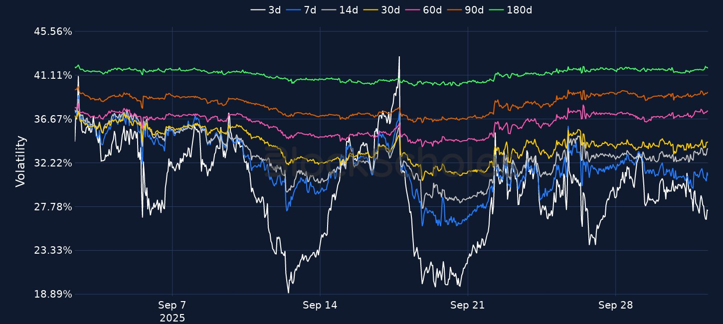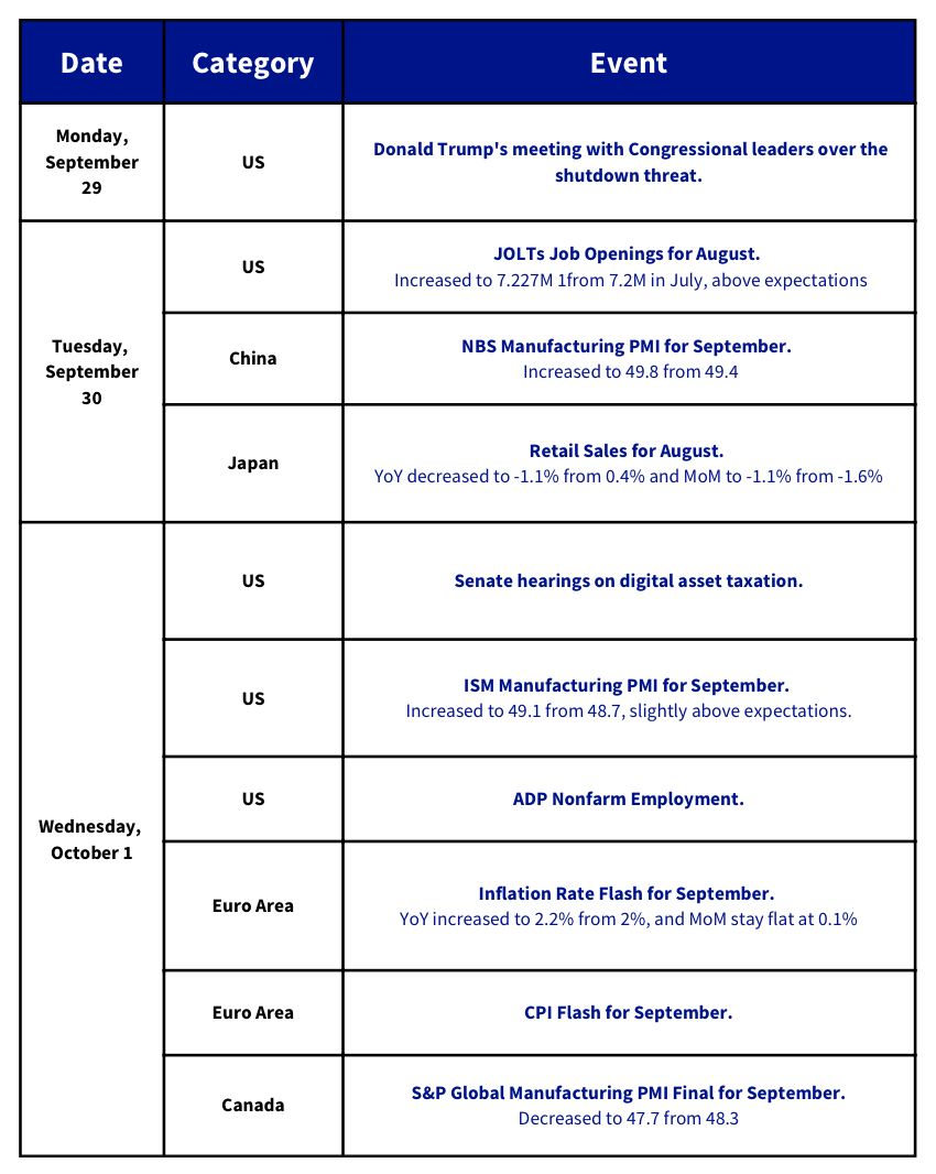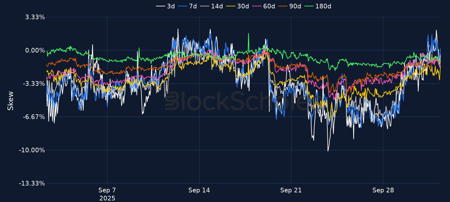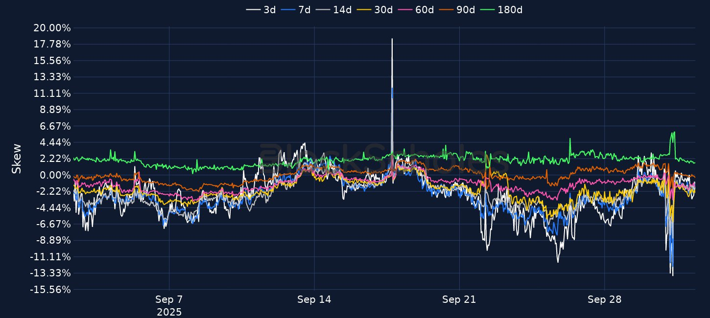 BTC and ETH kicked off “Uptober” with strong gains, up ~4% and ~6% respectively, supported by three straight days of inflows into spot ETFs ($270M BTC, $55M ETH). Options markets show fading bearish skew, with BTC and ETH 7-day smiles nearly neutral. The move aligned with a broader risk-on rally, as the S&P 500 hit fresh highs despite a prolonged U.S. government shutdown. Weak ADP payroll data (-32K vs. +51K expected) pushed Treasury yields lower (2Y ~3.55%, 10Y ~4.10%) and gold to a record $3,898/oz. On the structural side, tokenization dominated headlines: Trump-linked WLF unveiled debit cards and commodity tokenization, Telegram will enable tokenized equities via Kraken, and Sui Group plus Avalanche Treasury announced major stablecoin and treasury deals.