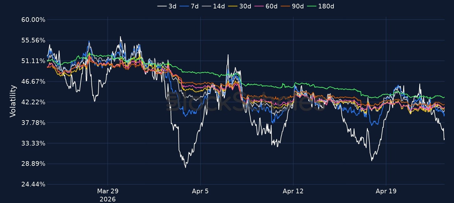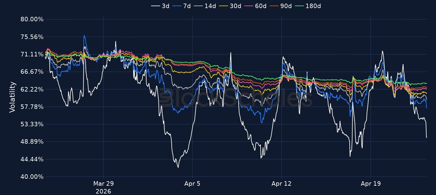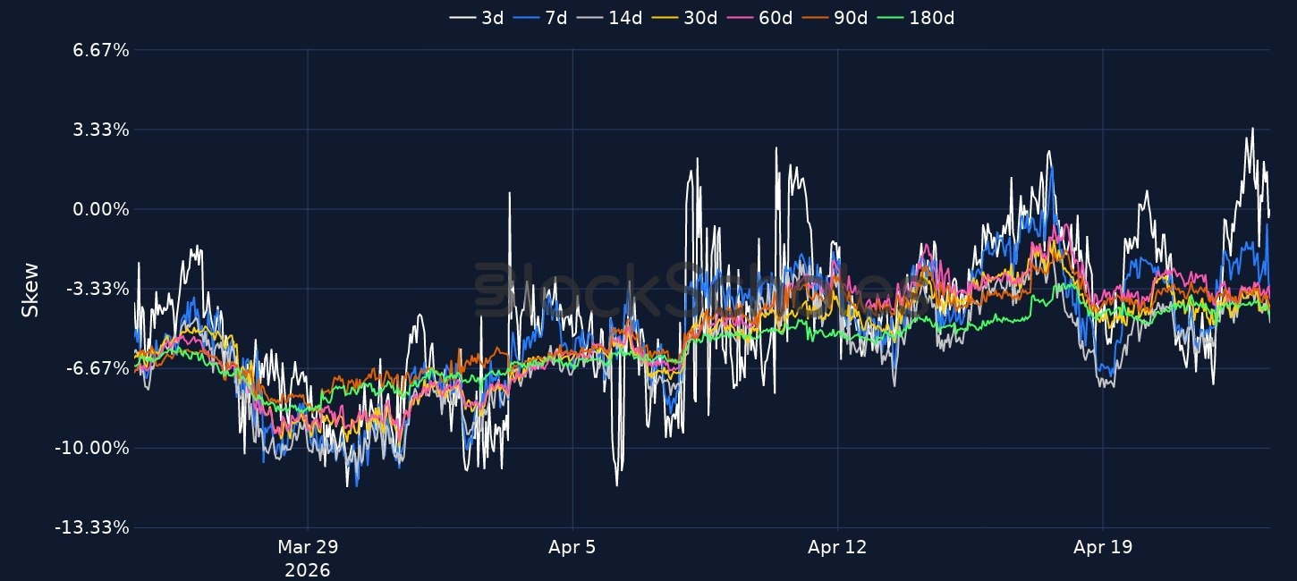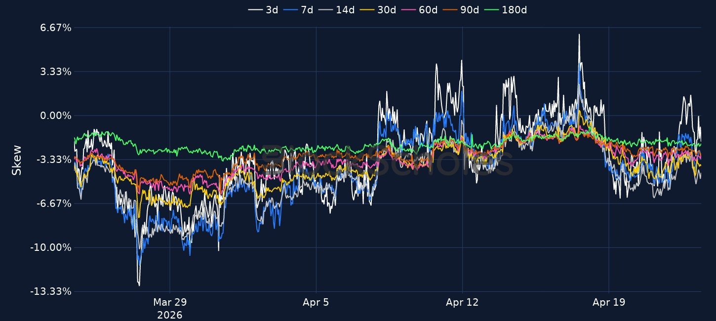 - The nearly-three month high in spot price has had some effect on the 25-delta skew at the front end of the term structure. The put-premium in 7-day options has risen from -3% to -0.6%, though has yet to rise enough to turn positioning in options markets bullish.