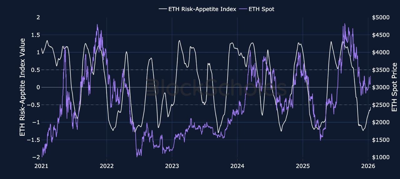 Block Scholes’ Risk Appetite Index measures the level of euphoria (above 1) or panic (below -1) in the spot market. Momentum in this index shows a strong relationship to spot returns.