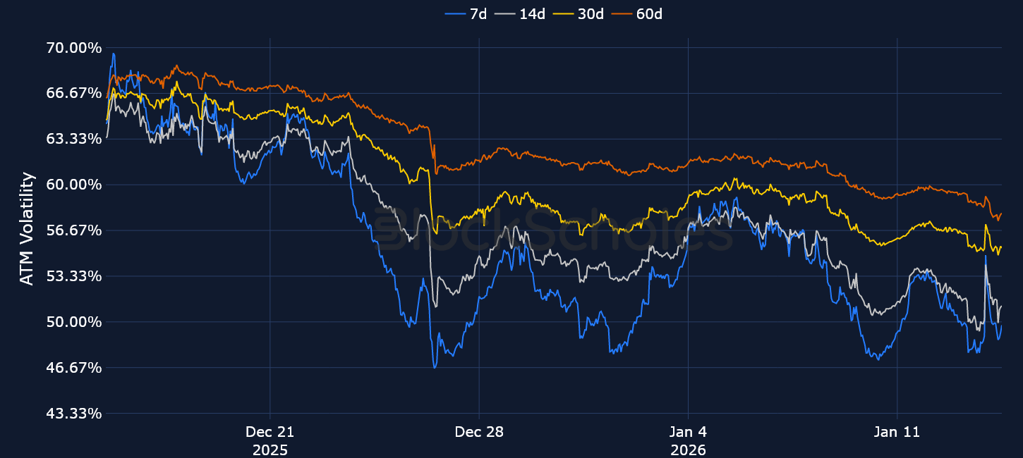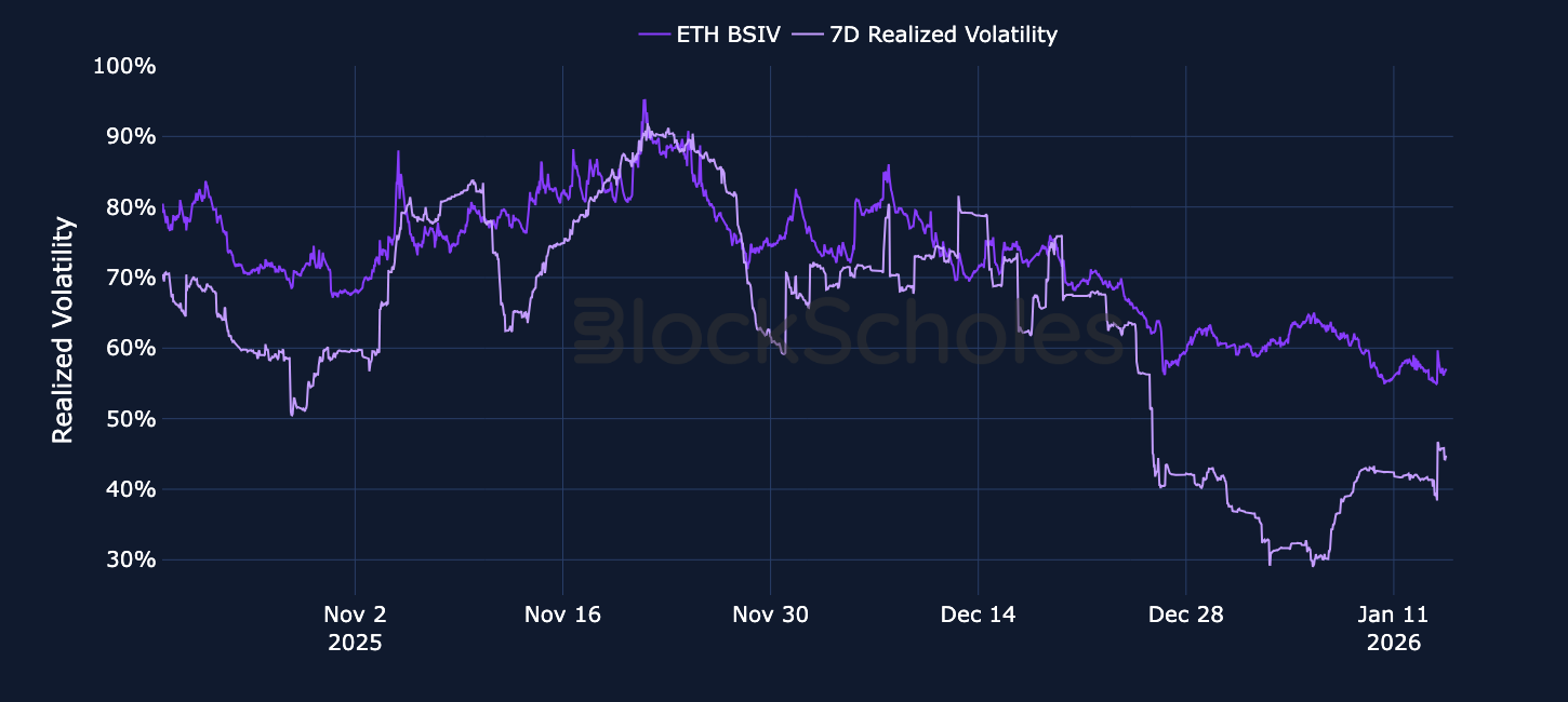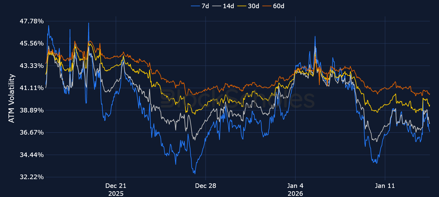 Additionally, spot ETFs for both majors show positive inflows year-to-date. ETH has also benefitted from idiosyncratic, on-chain tailwinds: demand for staking continues to soar, with 30% of the total ether circulating supply currently being staked. Despite the breakout from a month-long period of consolidation and various macro risks in the form of US-Iran tensions, December’s NFP release, December’s CPI report, a grand jury subpoena issued to the Federal Reserve, volatility has continued to trend lower.