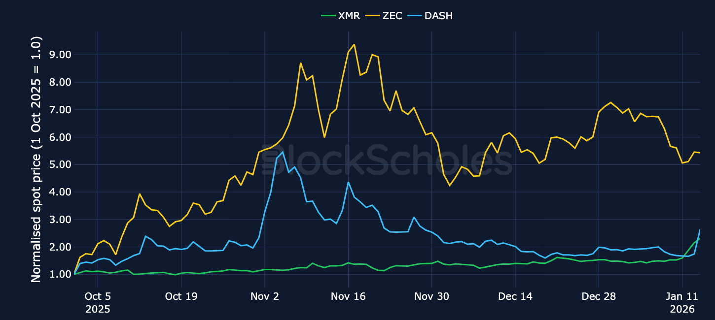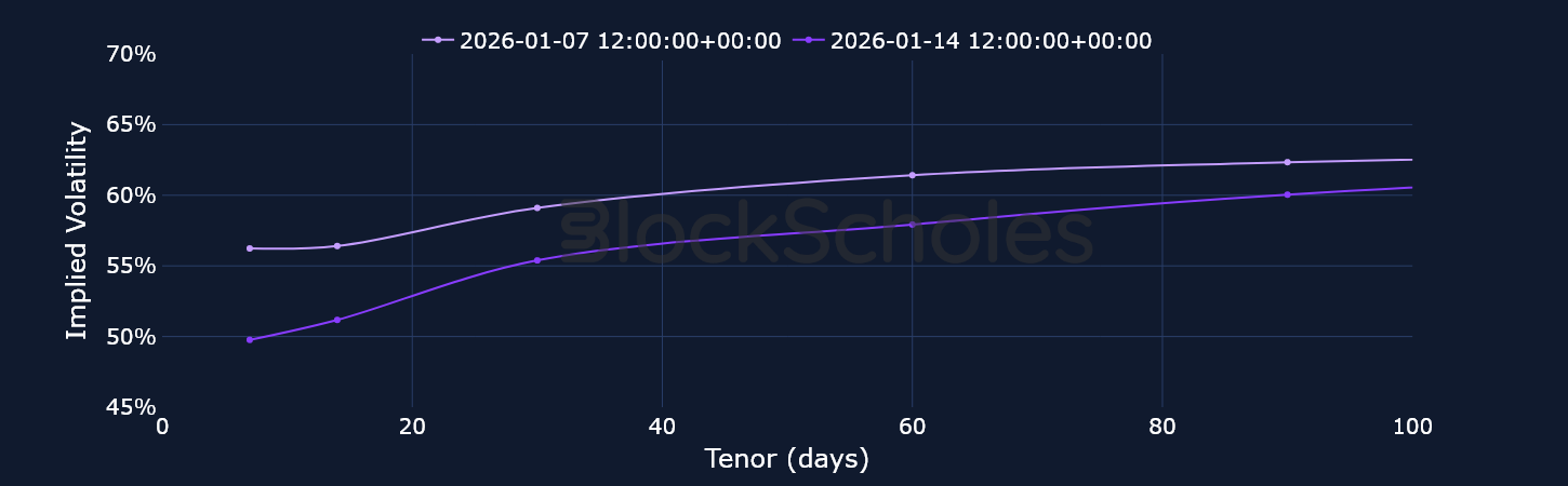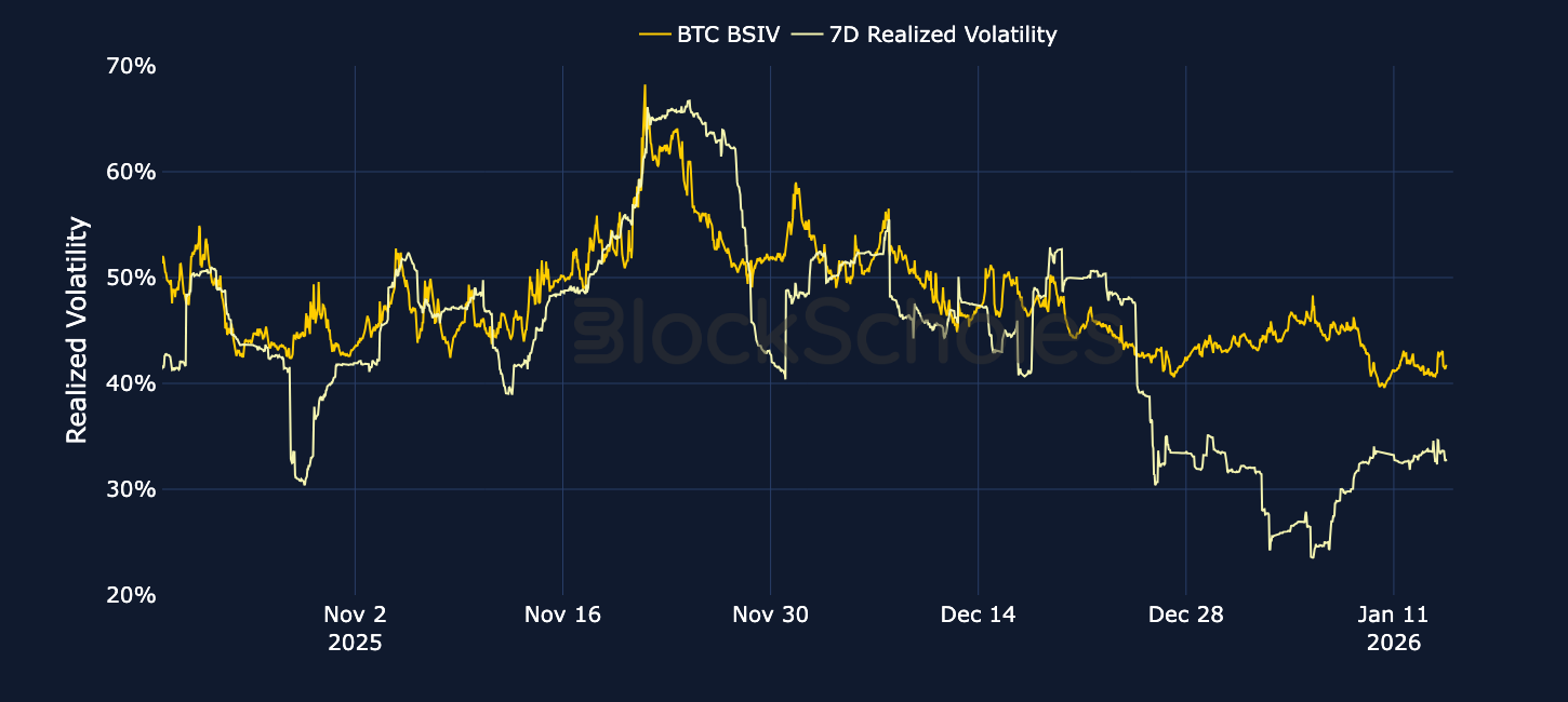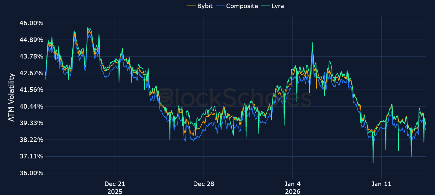 Additionally, spot ETFs for both majors show positive inflows year-to-date. ETH has also benefitted from idiosyncratic, on-chain tailwinds: demand for staking continues to soar, with 30% of the total ether circulating supply currently being staked. Despite the breakout from a month-long period of consolidation and various macro risks in the form of US-Iran tensions, December’s NFP release, December’s CPI report, a grand jury subpoena issued to the Federal Reserve, volatility has continued to trend lower.