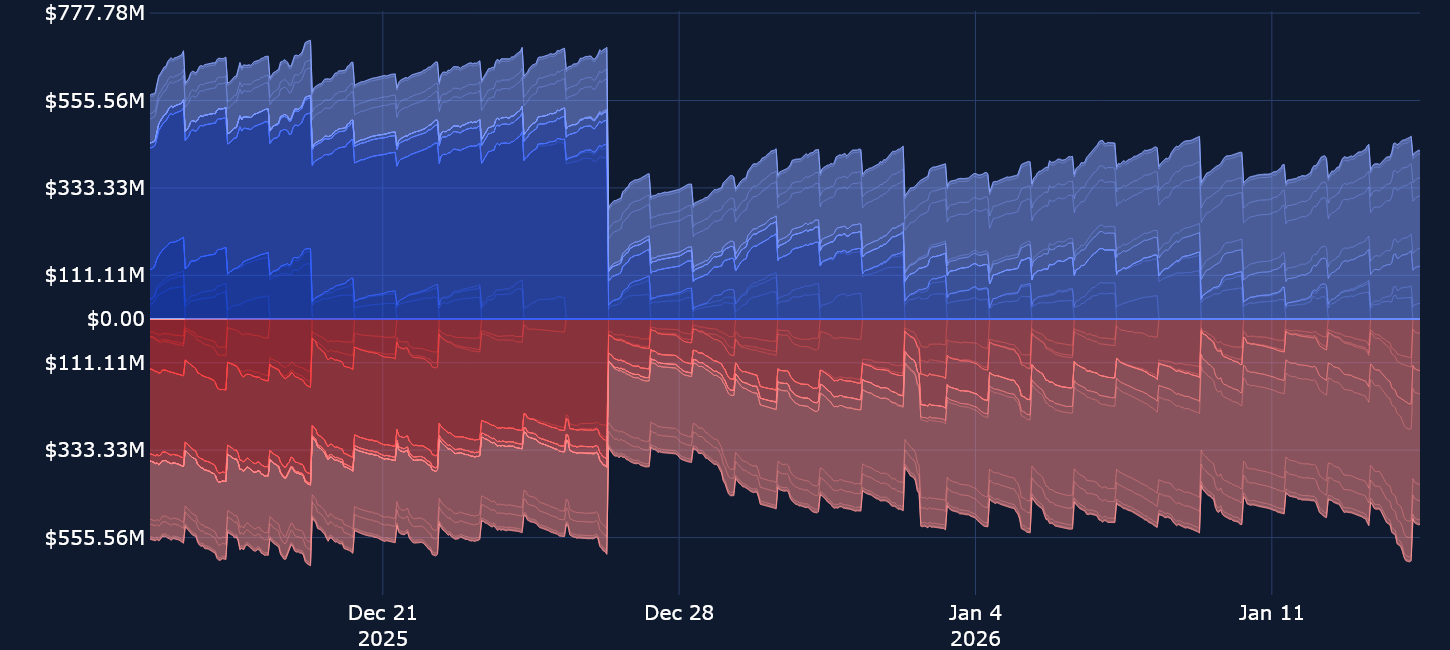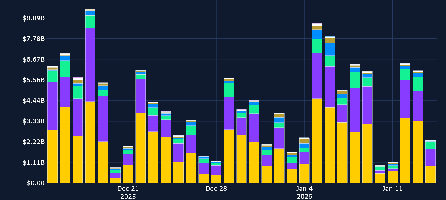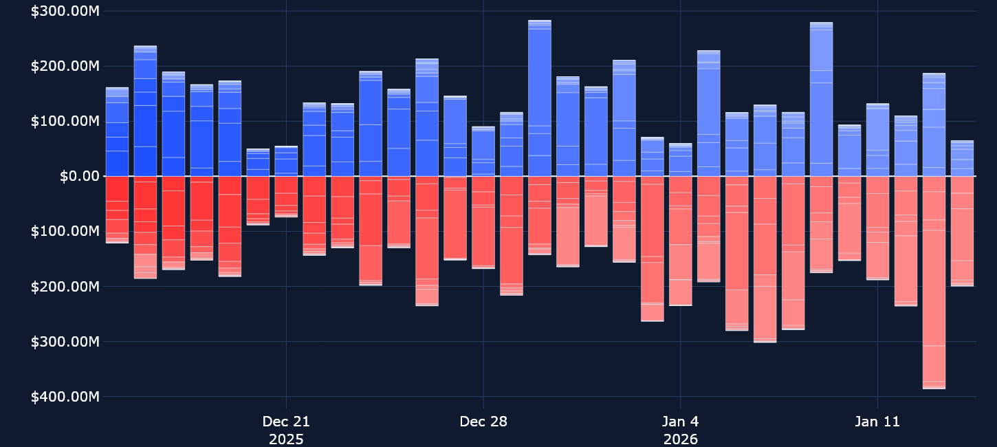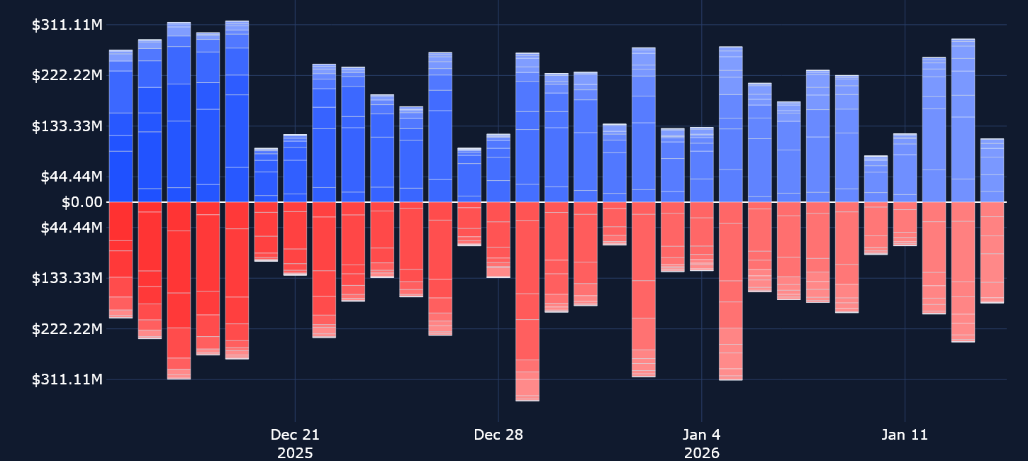 BTC’s spot price rally has been supported by Spot ETF inflows, however. Year-to-date, BTC Spot ETFs have seen net inflows of $660M, with $760M in net inflows on Jan 13, 2026 - the biggest one-day haul since the 10/10 (Oct 10th) historic liquidation event.