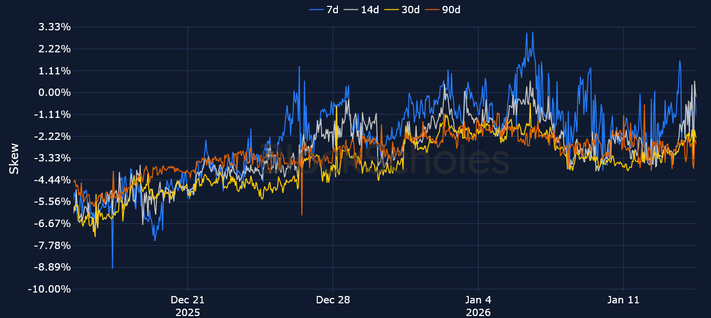 Options: BTC and ETH volatility smiles are now pricing in a neutral skew for short-dated optionality – a shift from the previously bearish put-skew. We’ve seen that before already this year however, when the move to $94K in early January saw a neutral skew that eventually reverted back to puts as BTC failed to hold that price level.