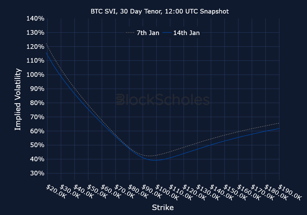 Options prices are used for Block Scholes’s implied volatility calculation services in order to calibrate volatility surfaces, from which all derivatives volatility analytics displayed in the BTC Options and ETH Options sections of this report are calculated. Volatility smiles are constructed by calibrating to mid-market prices observed in Bybit options markets. As part of the calibration process, prices go through rigorous filtration and cleaning steps, which ensures that the resulting volatility surface is arbitrage-free and has exceptional fit to the market observables.