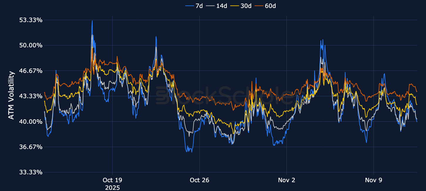 SOL options have recorded several days of trade volumes dominated trading in bearish put options. More than $150M of longer-dated put contracts changed hands between Nov 6 and Nov 9, 2025. However, as this occurred after the large sell-off in SOL spot price at the beginning of November and does not appear to have had a lasting impact on open interest, we cannot conclude there has been a lasting shift towards further bearish positioning.