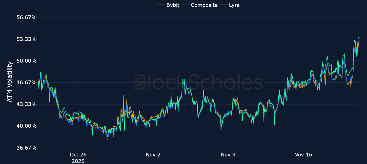 Realized volatility of ETH’s spot price has surged towards 90% as ETH trades 14% lower over the past week and 45% lower than its Aug 24, 2025 all-time high. ATM implied volatility across the surface has in turn exploded to the upside, with the front end of the term structure touching 86%. That has resulted in a term structure inversion, similar to BTC’s, but at higher outright volatility levels. Once again, such elevated levels of volatility over the foreseeable future is unsurprising, given that ETH now trades at a five month low, falling below $2,700. In turn, positioning remains bearish in Ether denominated options contracts, with volatility smiles firmly skewed towards OTM put contracts across the whole curve.