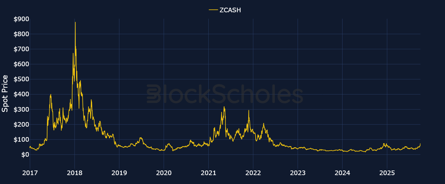 Zcash (ZEC) is a privacy token launched in 2016 that focuses on advanced zero-knowledge (ZK) proof technology. Since its launch, the token has aimed to offer a more advanced level of privacy when using it for transactions through “shielded addresses,” which are designed to encrypt transaction and address data stored on its blockchain. It has rallied in both of the previous bull runs/altcoin season cycles — first in 2017–18, when it surged to almost $900, and once more in 2021, when it rallied from $50 to upward of $300.