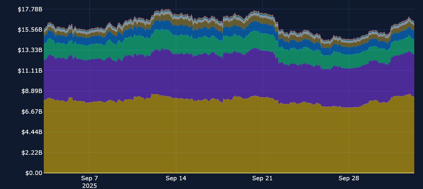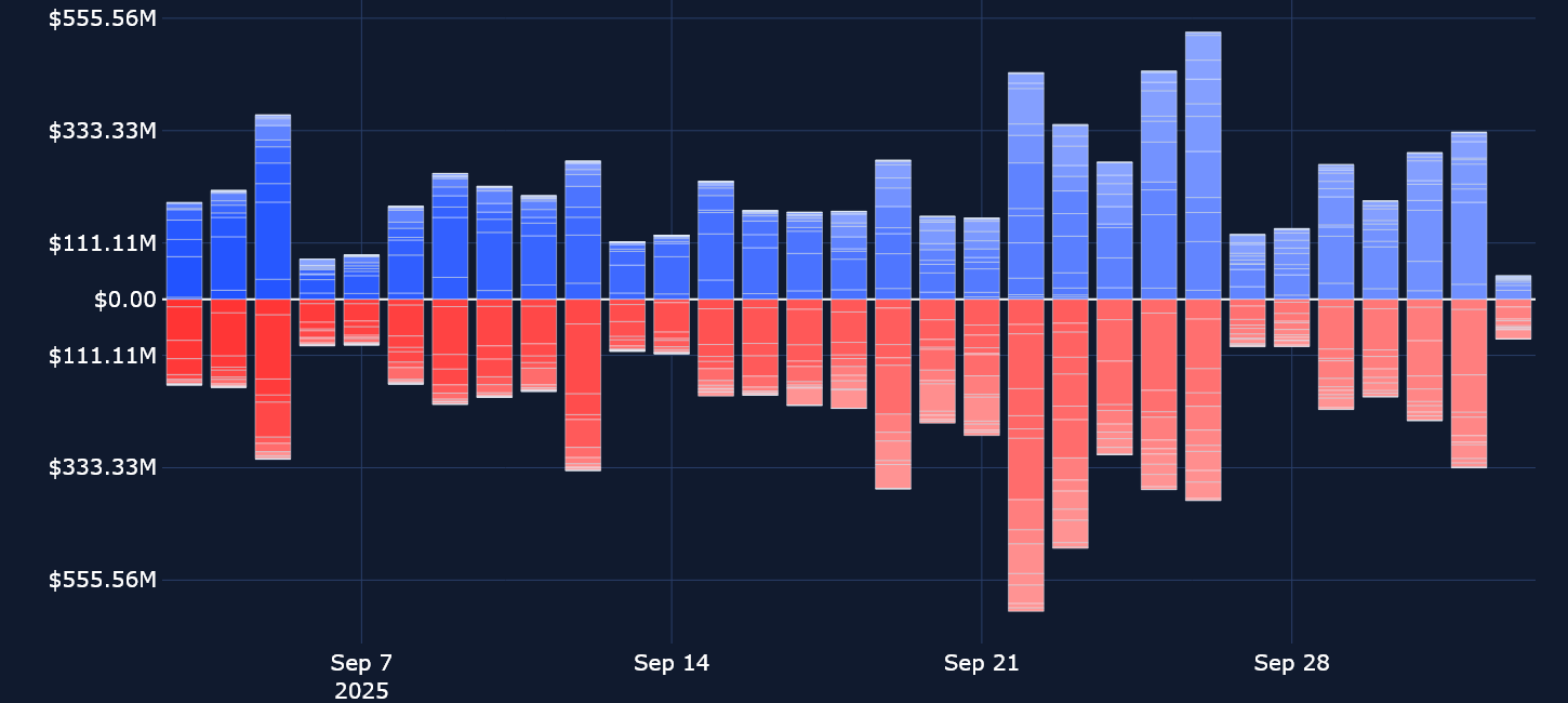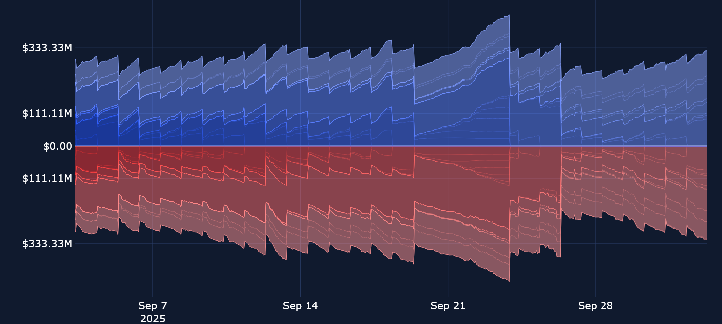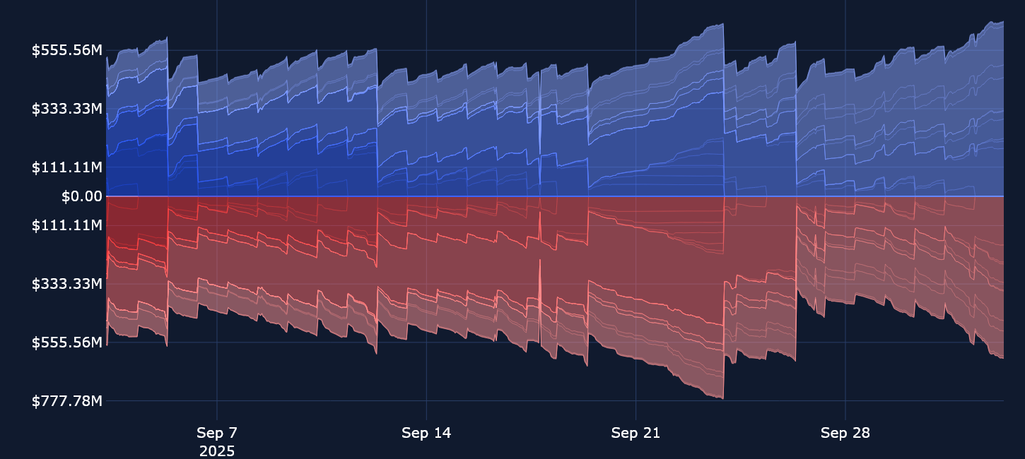 Open interest in leveraged perpetual swaps markets has dropped off from the all-time high levels that were reached in the run-up to the Federal Reserve’s September FOMC meeting. On Monday, Sep 22, 2025, the largest long liquidation event of the year took place, with more than $1.5B in long positions being liquidated across exchanges. This is certainly visible in the open interest chart (below). Between the late evening of Sep 21, 2025 and the early morning of Sep 22, 2025, open interest in ETH contracts plunged from $5B to $4.3B, as Ether’s spot price fell by more than 9% on the day.