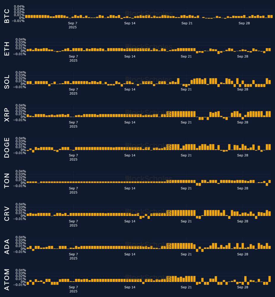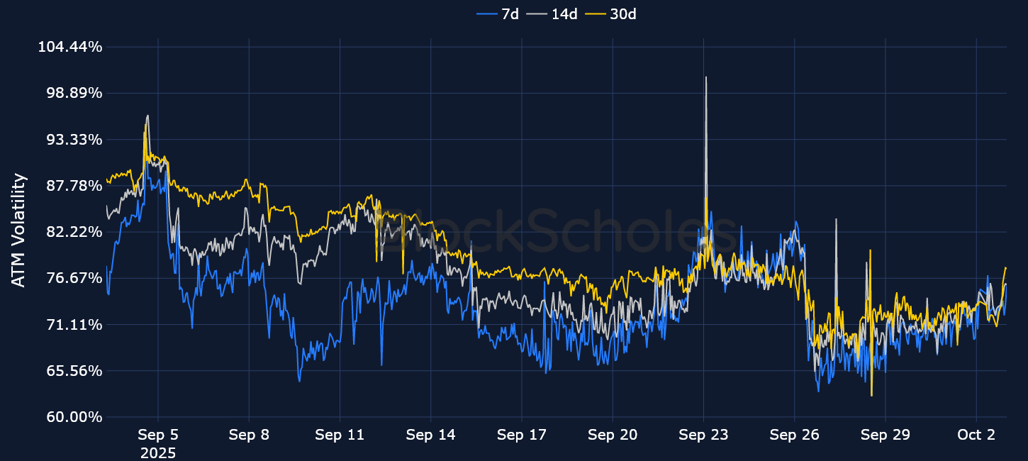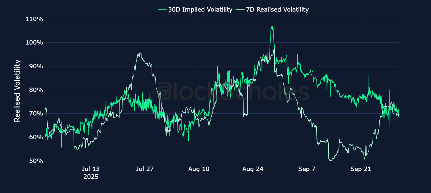 The large divergence between SOL’s realized volatility and implied volatility in the middle of September has now been resolved, with both measures registering at around 70%. Alongside BTC and the wider crypto market, SOL’s spot price rallied in the first half of the month, reaching a monthly high of $250. This was also bolstered by bullish announcements from digital asset treasury companies venturing into the token to form treasury reserves — something that was initially limited to just BTC and ETH. Most of those gains, however, have been lost through the second half of September, as SOL’s spot price fell to a low of $192.