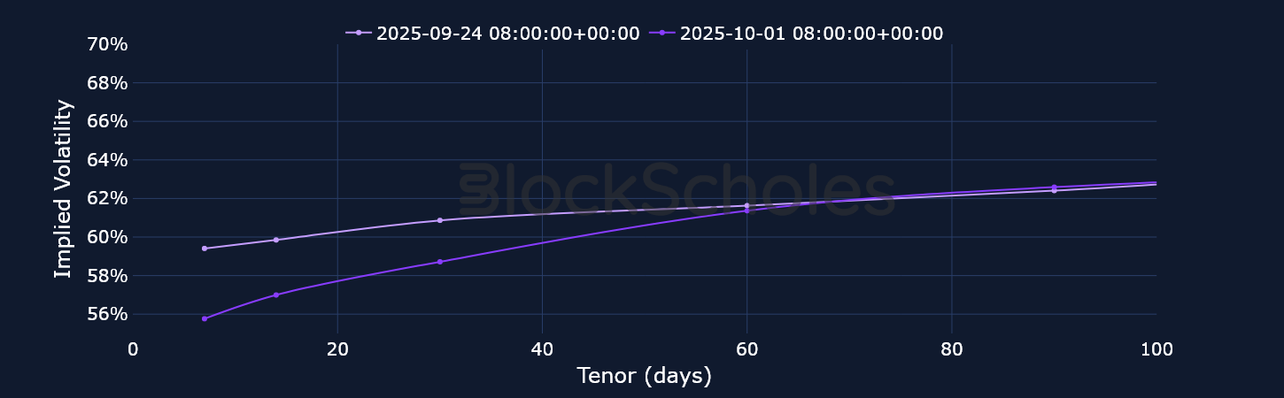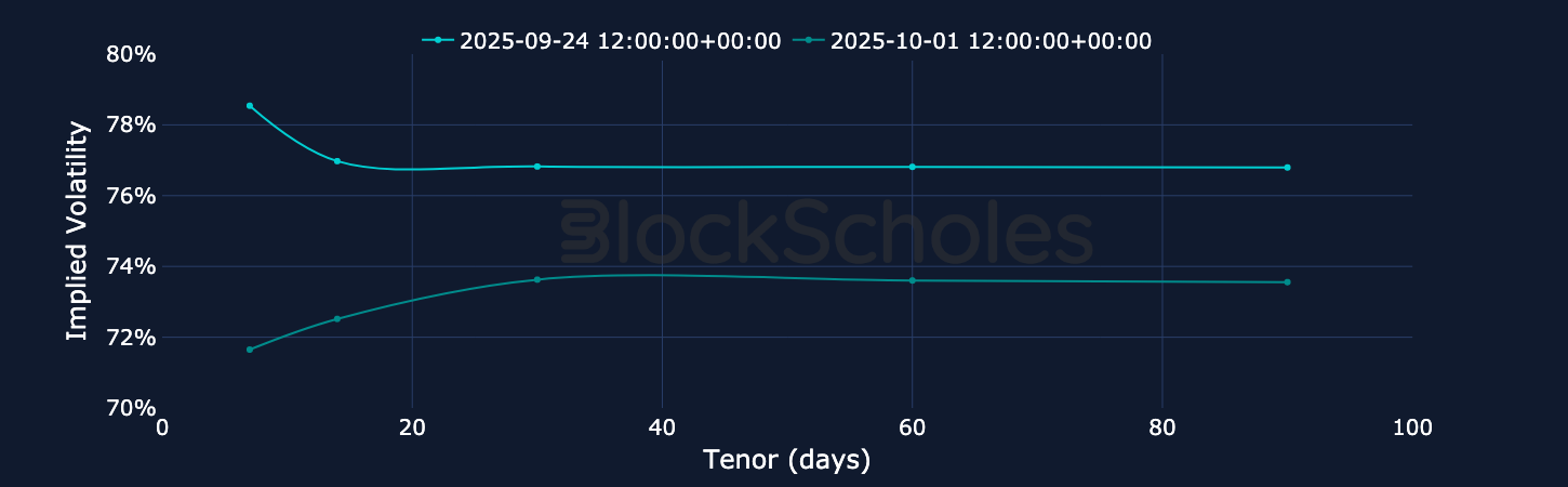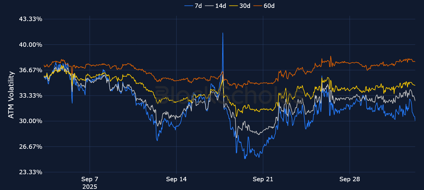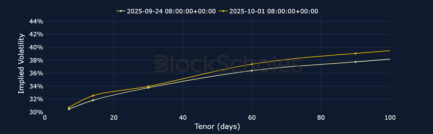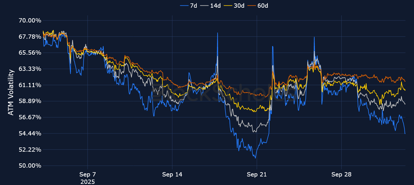Despite some major twists and turns, September ultimately ended up being a modestly bullish month for BTC, as it closed the month trading at $114K (relative to a $107K open). Nevertheless, options markets have refused to price out their bearish expectations, as volatility smiles across the term structure remain put-skewed. Over the past few days, that skew has eroded, particularly for short-tenor options, though it still remains slightly negative.