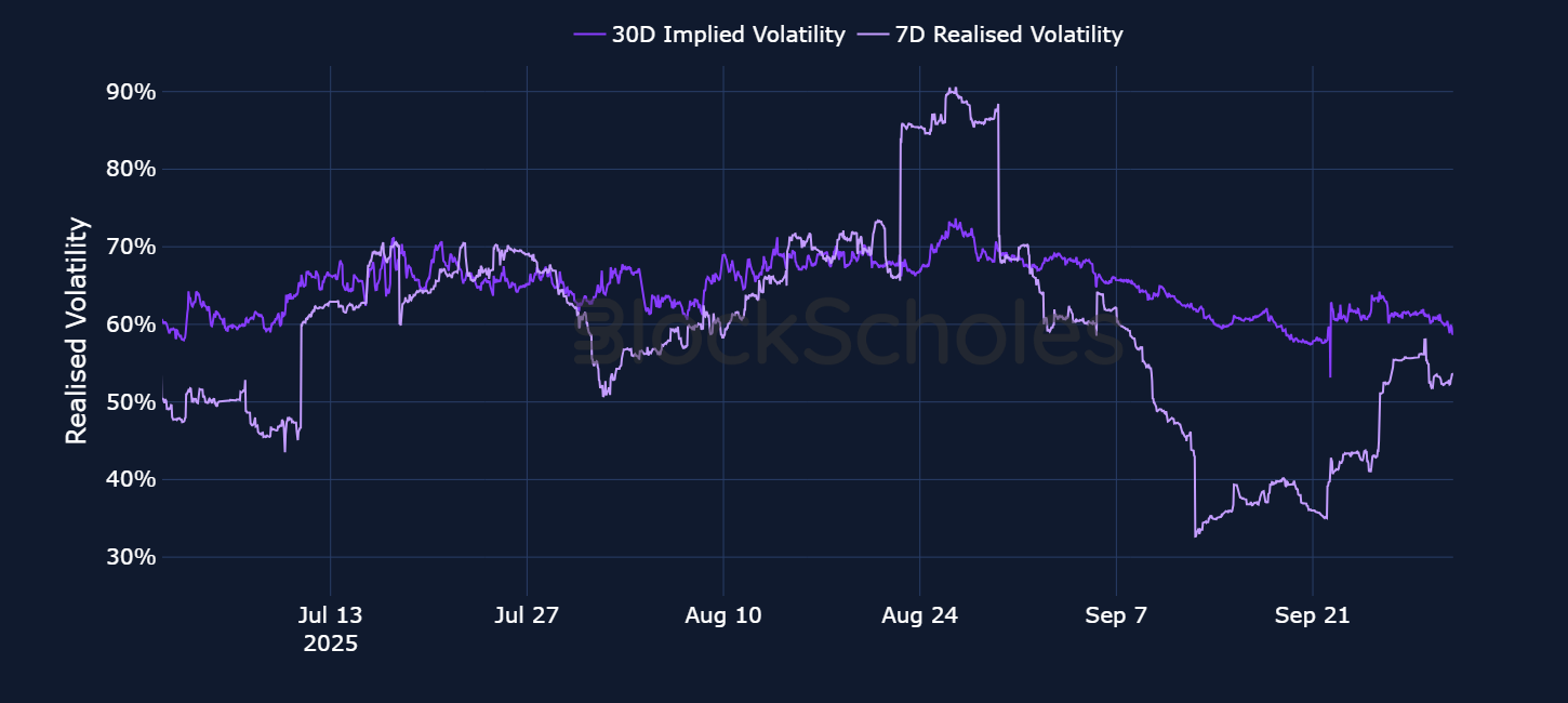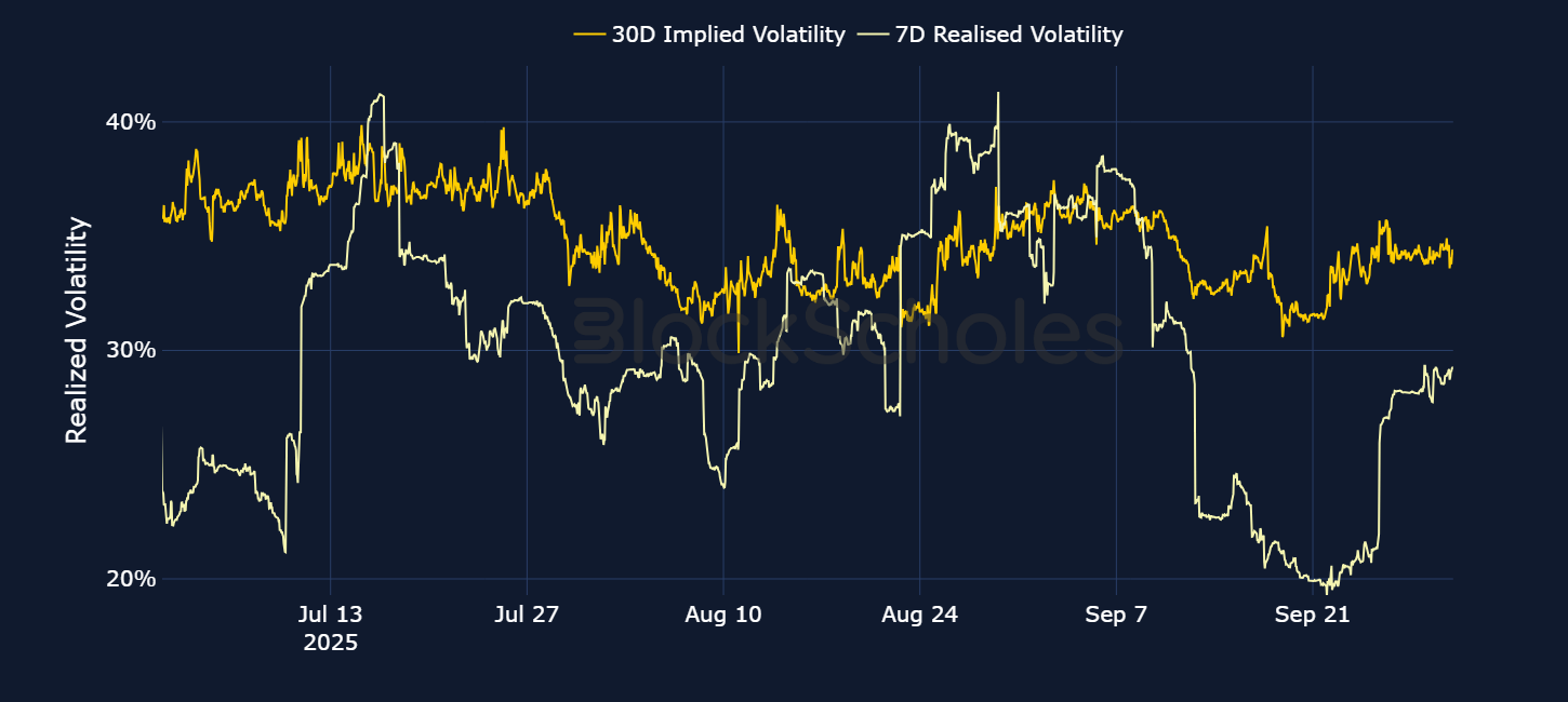 After a brief inversion in the term structure during the FOMC meeting on Sep 17, 2025, BTC’s implied volatility has once more trended back toward its historic lows. That move in ATM volatility appears to have been a byproduct of the complete collapse in realized volatility following the FOMC meeting. On Sep 21, 2025, 7-day realized volatility fell below 20% — a level last seen in mid-2023, barring several instances earlier in 2025.