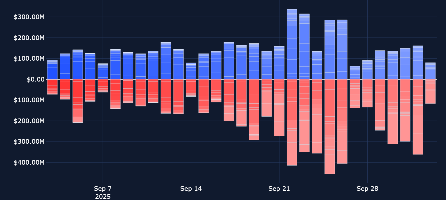 Recently, both call option volumes and put option volumes have been quite small relative to the two major periods in the middle of the month. On Sep 18, 2025, put option volumes reached $100M, concentrated in longer-dated expirations and far exceeding the volume in calls.