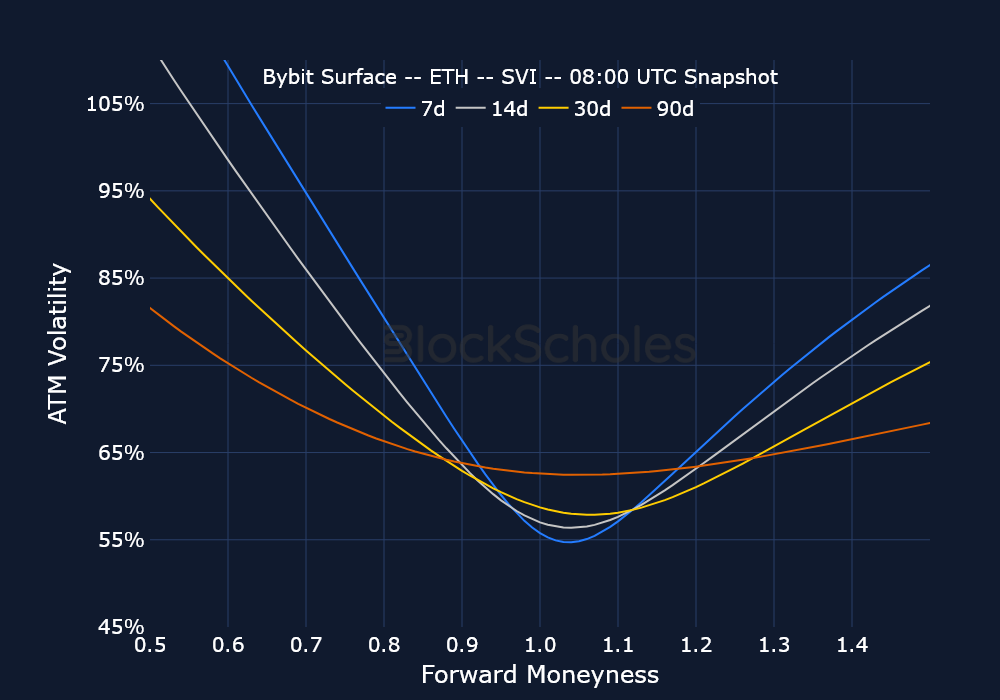 BYBIT ETH VOLATILITY TERM STRUCTURE — Short-tenor volatility has dropped 4 volatility points relative to last week, while tenors further out remain unchanged.