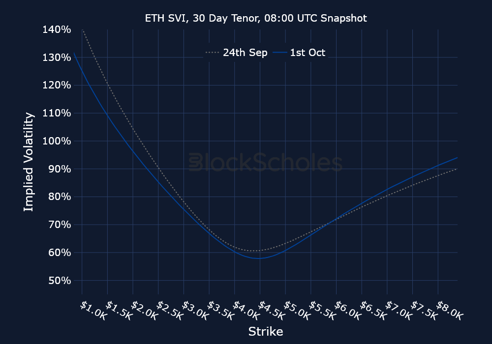Throughout September, both BTC’s and ETH’s volatility smiles painted a similar story to the movements in spot markets until the middle of the month, as spot prices rallied progressively higher. Options traders began to price out their bearish sentiment, and volatility smiles eventually tilted toward calls. Then, as the FOMC September meeting passed and spot prices began to sell off in the second half of the month, volatility smiles began to skew further toward OTM puts.