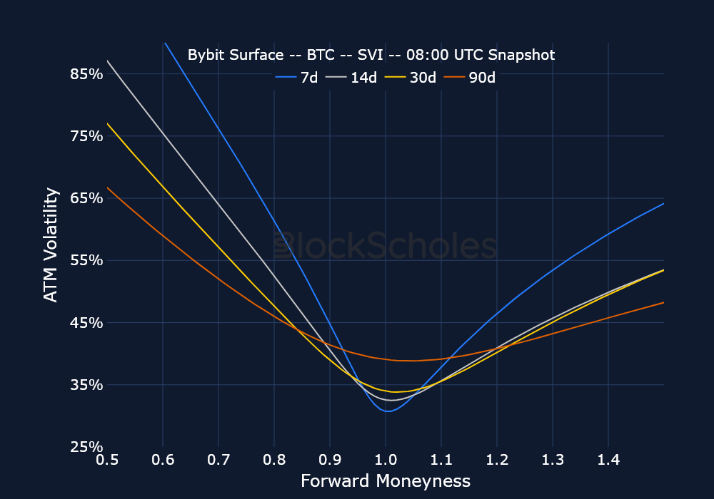 Options prices are used for Block Scholes’s implied volatility calculation services in order to calibrate volatility surfaces, from which all derivatives volatility analytics displayed in the BTC Options and ETH Options sections of this report are calculated. Volatility smiles are constructed by calibrating to mid-market prices observed in Bybit options markets. As part of the calibration process, prices go through rigorous filtration and cleaning steps, which ensures that the resulting volatility surface is arbitrage-free and has exceptional fit to the market observables.