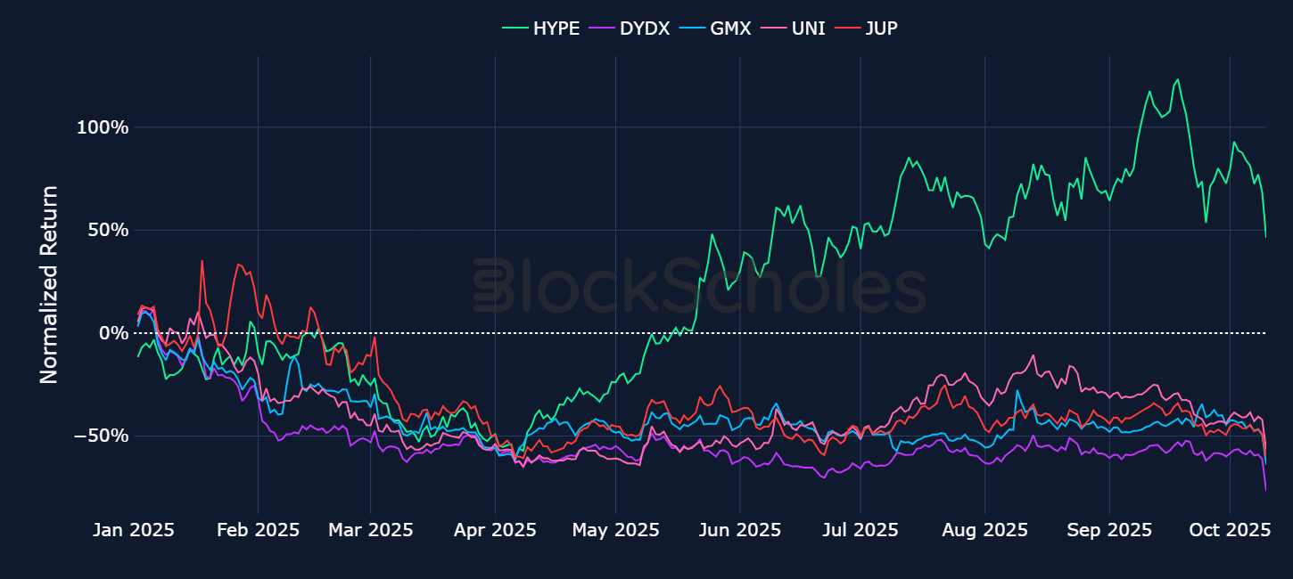 But what about the post-April rally? Is it reflective of all perp DEX tokens, or was it limited only to HYPE? When we compare the normalized returns of HYPE to those of JUP [the native token of the Jupiter perp (and spot) DEX], DYDX (the native token of the dYdX perp exchange) and GMX (the native token of the GMX exchange), we find that HYPE is clearly the outlier — as all of the aforementioned tokens’ prices are down close to 50% year-to-date, similar to spot DEX tokens such as UNI.
