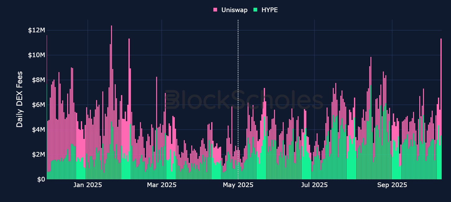 Could this reflect HYPE’s market share grab from the previous leaders in the DEX space? There is some evidence to support this assertion. At the beginning of this article, we explained that Hyperliquid began to overtake Uniswap in total daily DEX fees from May 2025. The almost vertical doubling in HYPE’s price from below $20 to upwards of $40 in May coincides with the period in which Hyperliquid began to outperform Uniswap in daily fee generation.