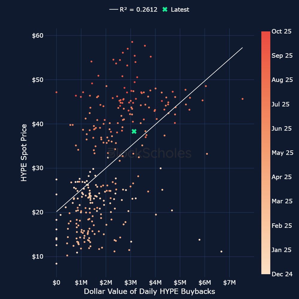 When we plot the dollar value of daily token buybacks, we find that — at times — Hyperliquid has purchased upwards of $6M worth of their native token, and that since May 2025, purchases above $2M have become the norm. Additionally, we find evidence that the buybacks do have a relationship with HYPE’s price. Below, we regress HYPE’s daily spot price against the dollar value of daily buybacks. According to this linear relationship, approximately 26% of the variation in HYPE’s price can be explained by token buybacks.