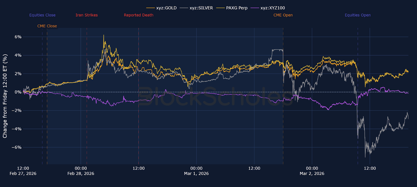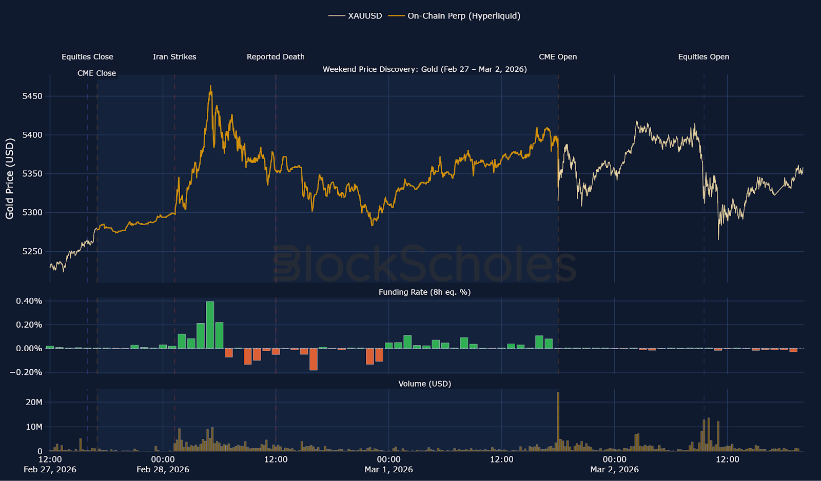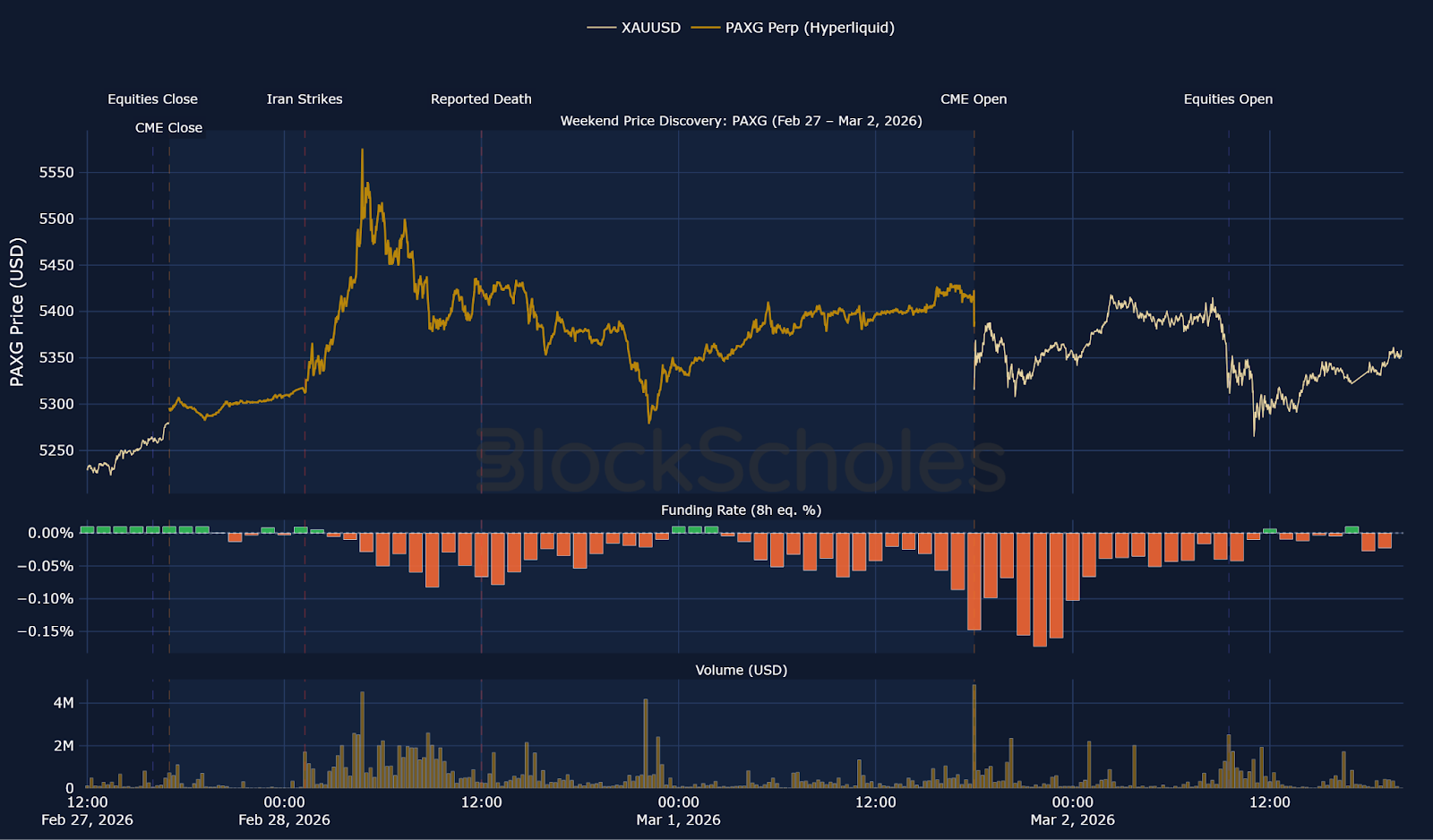 Price quickly reacted to strikes in Iran before any news release of the incident, peaking at $5,576, $112 above xyz:GOLD's peak of $5,464. This is higher than the peak in xyz:GOLD despite being a more mature market and having significantly more volume and market depth.