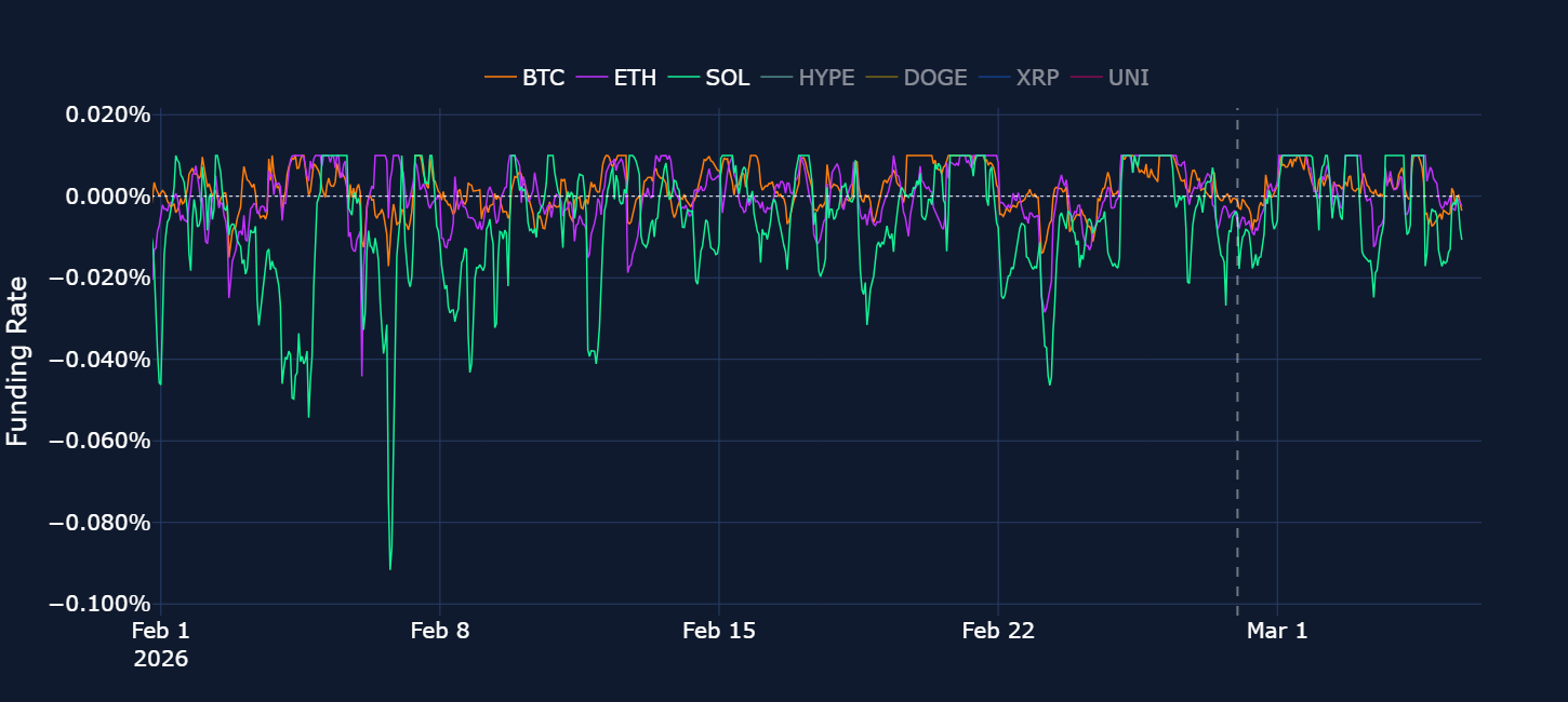 Negative funding rates indicate futures prices traded below spot prices, with short traders willing to pay a premium to hold their positions — at the start of the Middle East war, that sentiment was visibly more bearish in altcoins than in BTC.