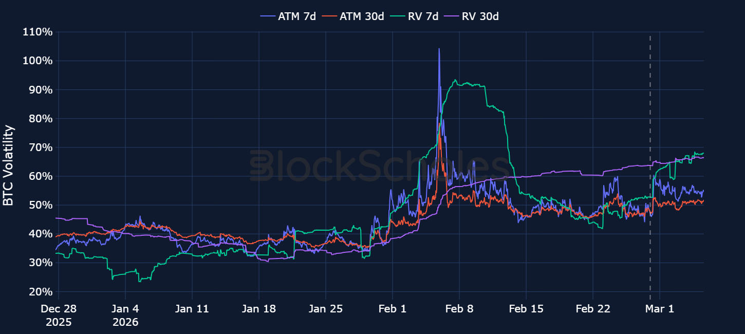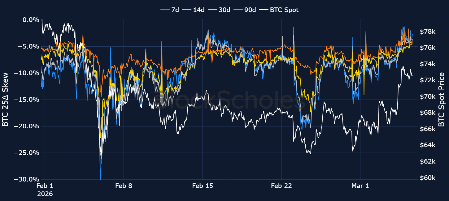 BTC option markets volatility smiles also show some of the bearishness having been priced out. As spot price revisited $63K, put options traded with a 15 vol point premium over calls (traders looking for downside protection). However, similar to the recovery in spot price, 25-delta put-call skew quickly bounced off its lows. Despite that bounce, make no mistake – options markets are still bearishly positioned across the volatility surface. However, they are still less bearish than during the weekend when the US-Israel strikes began.