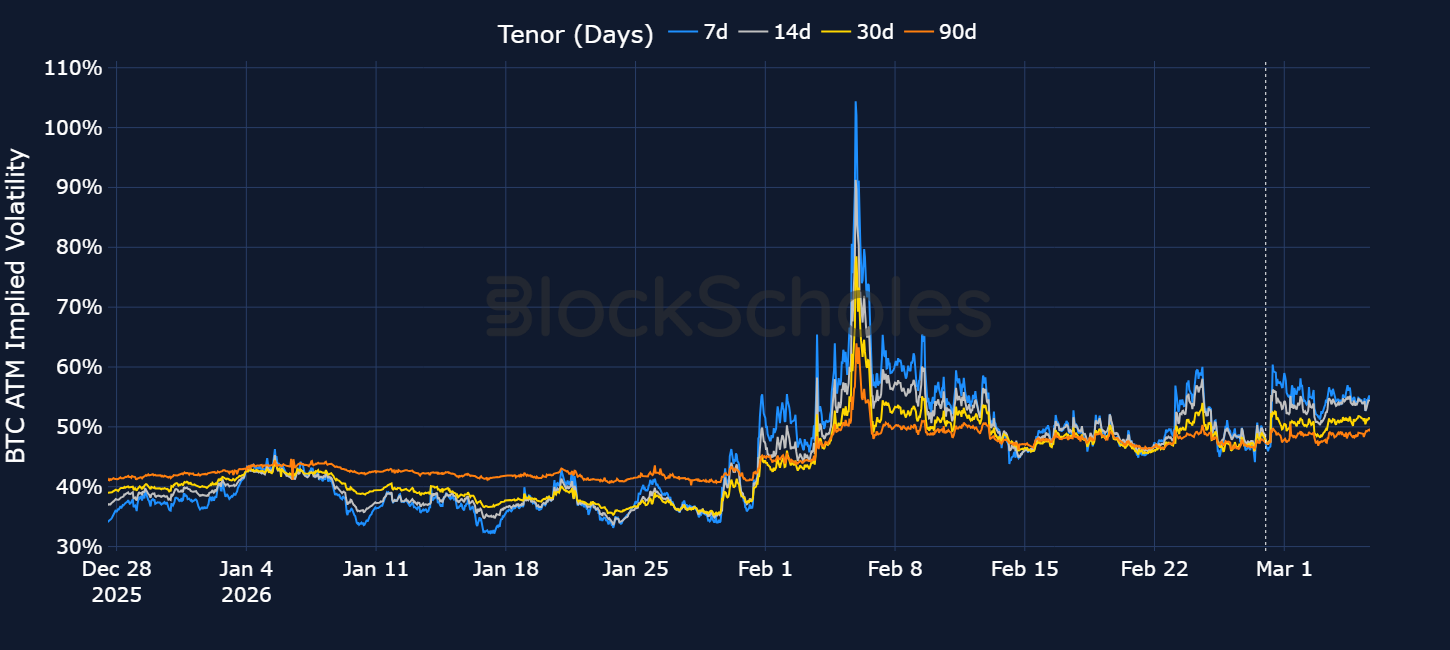 Despite escalating geopolitical tensions, crypto-asset spot prices have shown a sustained recovery in sentiment, with BTC briefly breaching $74K and ETH flirting with $2,200. Demand for optionality ticked up following President Trump’s weekend announcement that the US had launched airstrikes against Iran, with the latter then retaliating across the Gulf region – which moderately inverted the term structure of volatility, though absolute implied volatility levels remain far lower than their highs in early February. Relative to delivered volatility, implied volatility is also trading lower, and the skew towards OTM puts is no longer as strong as it was.