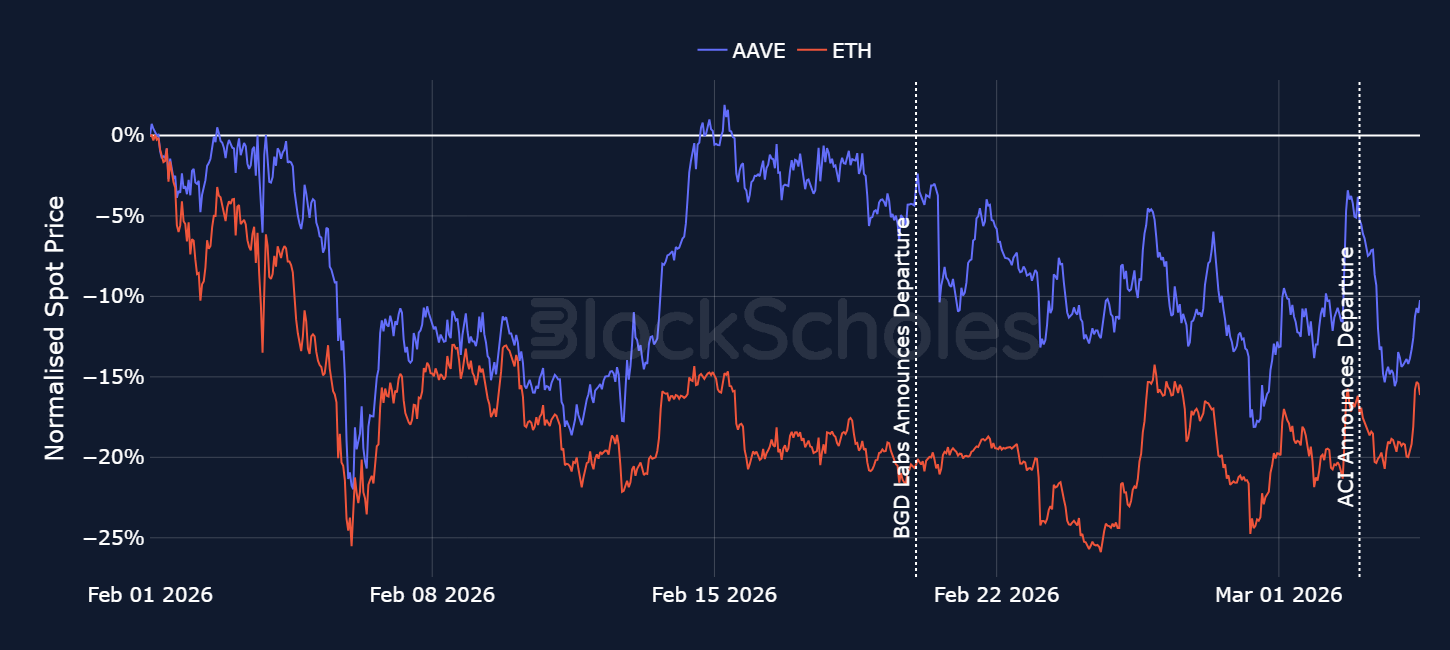 Despite Aave DAO turmoil, AAVE tracks and outperforms ETH, with only a brief single day spot price divergence following BGD’s departure.