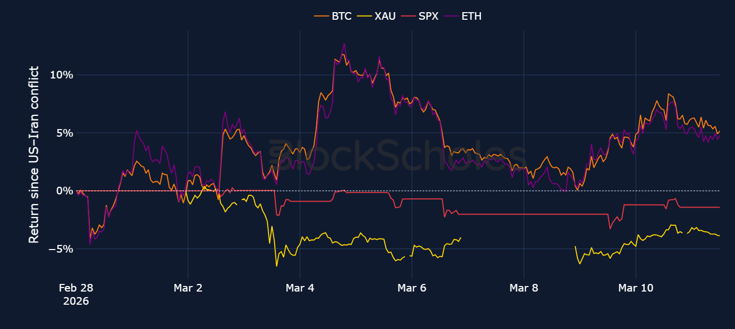 In fact, since markets opened on the Monday after the initial strikes, BTC has actually outperformed the S&P 500 and traditional safe-havens - gold and the US dollar.