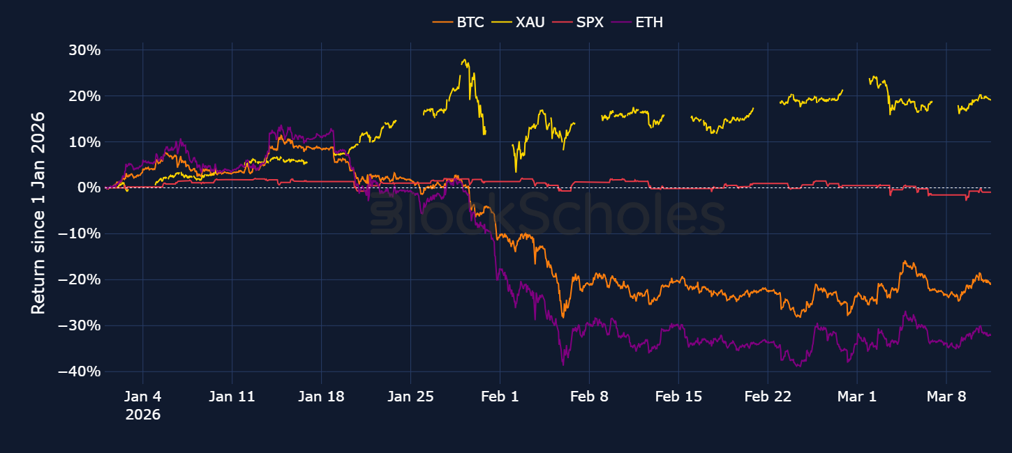 With the conflict in the Middle East now in its second week and BTC trading around $70K, Block Scholes’ Risk Appetite Index indicates tentative signs of panic bottoming out. In fact, since the US strikes on Iran began, BTC has outperformed both the S&P 500 index and gold, and even the currently preferred safe-haven: the US dollar.