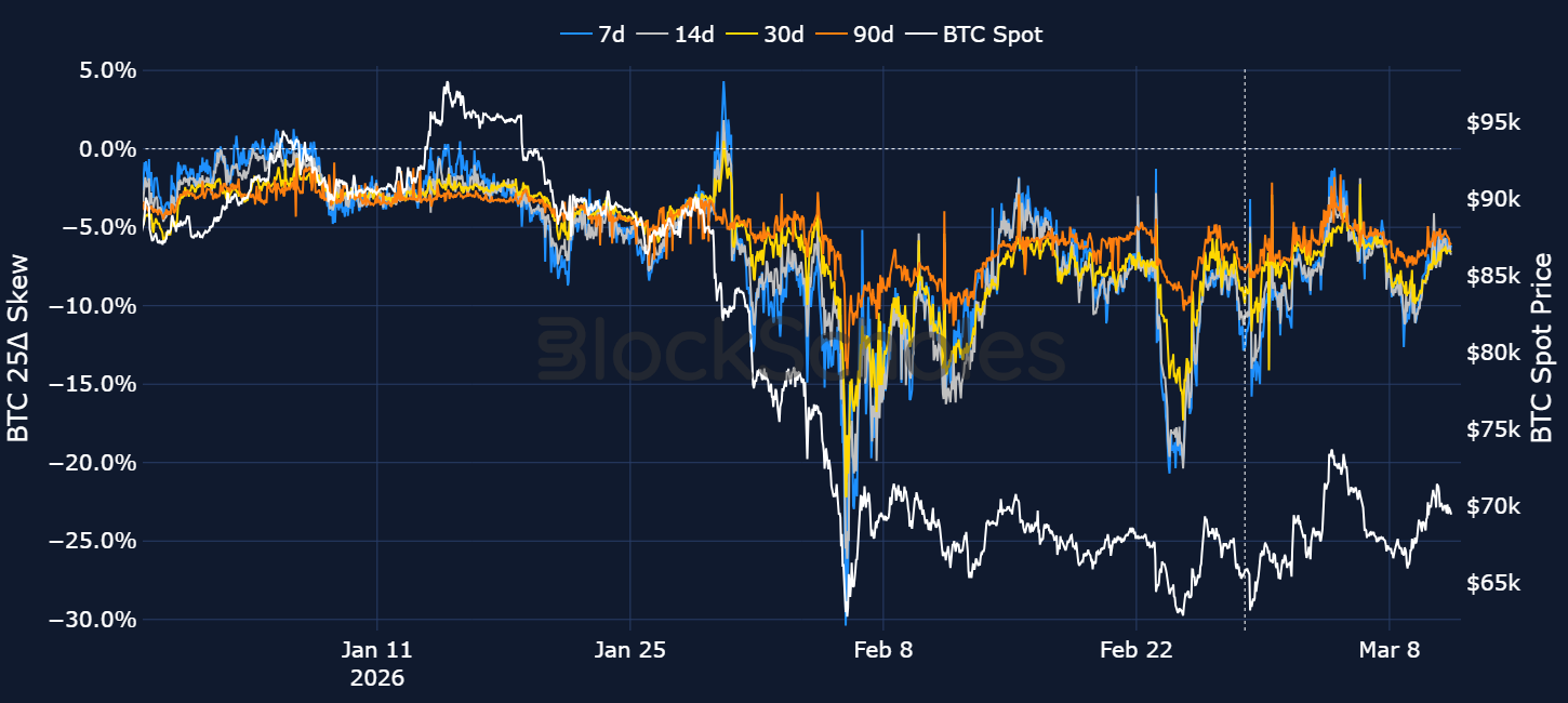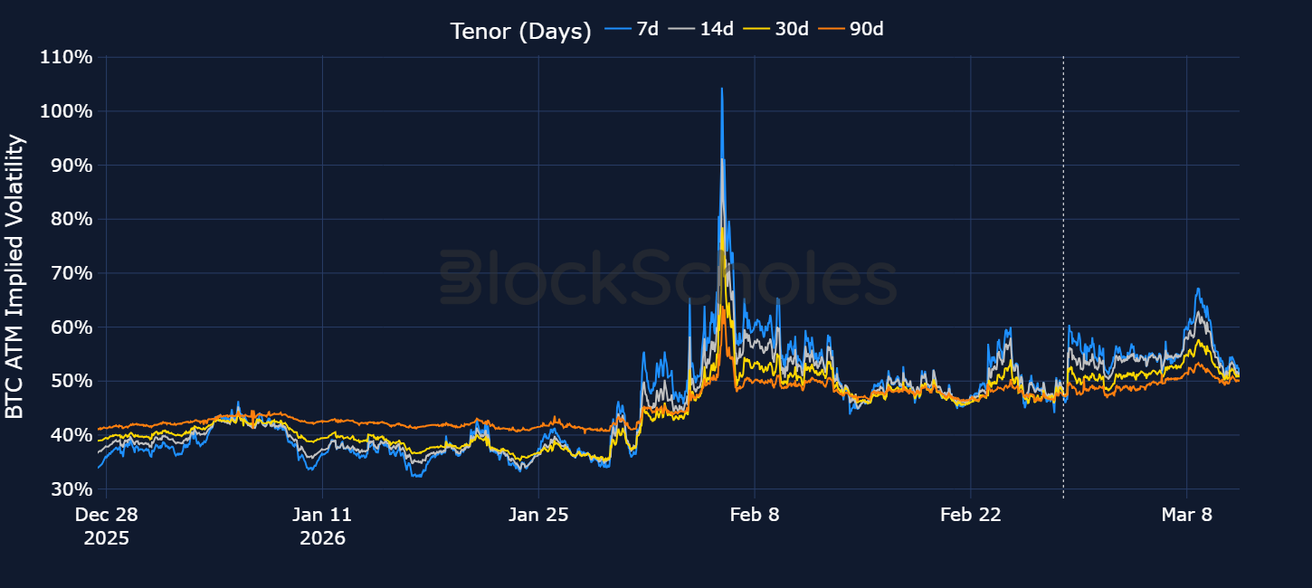 After rising to the highest level since 2022, short-dated implied volatility settled around 50% in mid-February before jumping 20 percentage points during the start of the Middle East conflict. In absolute terms, however, implied volatility (IV) remained far lower than the panic levels that were priced in during February’s peak when BTC fell towards $60K. Since then, IV has once more returned back towards the same 50% floor and the term structure has compressed.