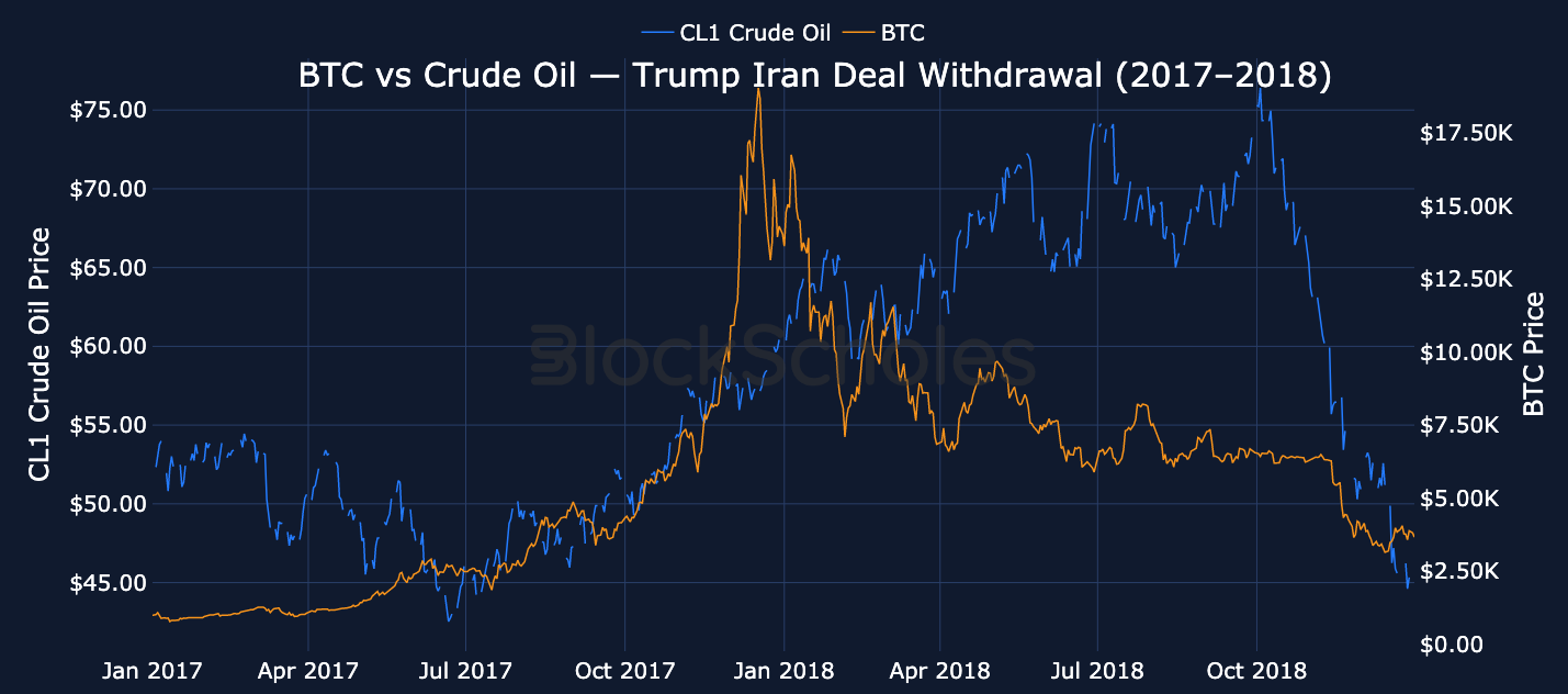 A previous period of US–Iran tensions in 2017 (during US President Trump’s first term in office) offers a useful comparison for how both BTC and oil markets responded. In 2017, oil prices spiked sharply and remained elevated for a period, reflecting concerns over potential supply disruptions while BTC rallied to its then-all time high, before reversing much of those gains throughout 2018.