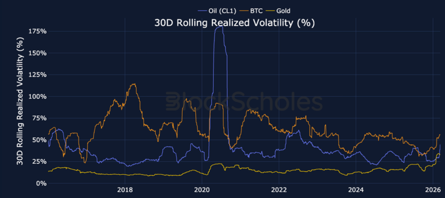 The onset of the Iran-US conflict created a step up in 7D Rolling Realized Volatility across oil, precious metals and the (more stable) US equity indices, yet BTC realised volatility has been climbing higher far earlier