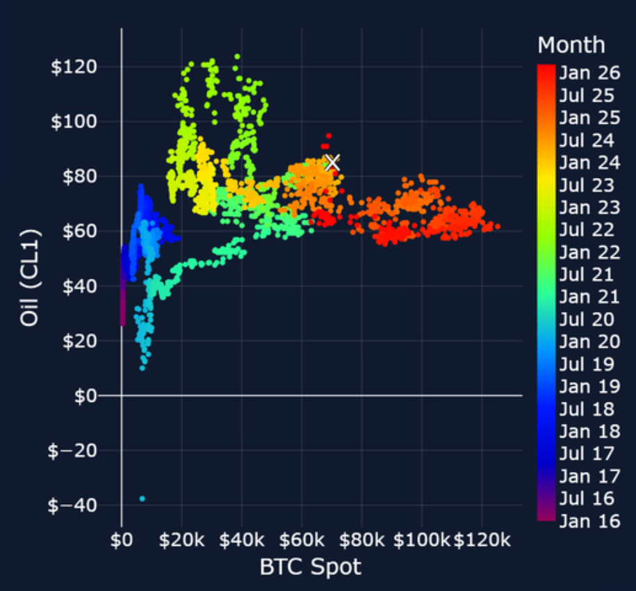 This time, BTC had been selling-off since the October 2025 all-time high and following the Oct 10th, 2025 liquidation event while oil prices had drifted sideways until early 2026. The spike higher in oil prices that followed the closure of the Straits of Hormuz occurred alongside BTC’s most recent relief rally to the top of its range at $70K, but bucks the trend of the previous movements in late 2025. While the geopolitical backdrop is similar to that in 2017, the reaction function (or apparent lack-therefore) in BTC is not.